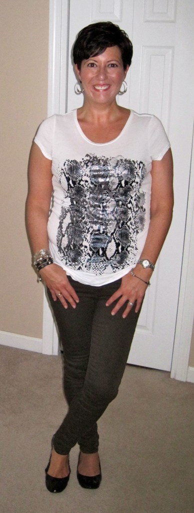 It’s raining here today so a bit cooler than it has been.  I decided to take advantage of it and wear some jeans while I can.  These are dark green legging jeans from Gap, worn with a snake print tee shirt from Express and my black patent Tory Burch Eddies.  My studded cuff is also Tory Burch.  I car pooled with MM today so was lucky enough to have a photographer – thanks honey:)