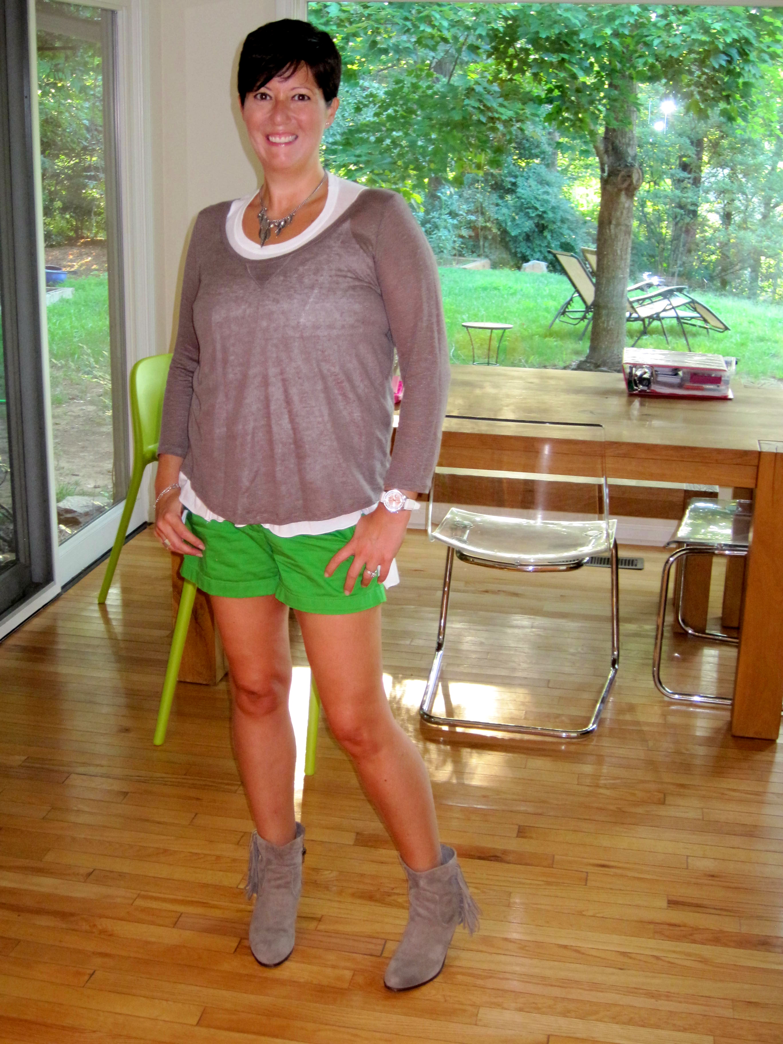 Thankfully my fabulous Husband was around this morning to take on the duty of photographing me. After a couple of days in tunics – sorry no photos – I opted for my fab J.Crew green chino shorts – these are 4″ but I noticed they had some 3″ and 5″ lengths in the sale online in other colors. I’m wearing them with my AllSaints vest, H&M linen jumper and fabulous Sam Edelman Louie tan suede boots. Ankle boots with shorts has to be one of my favorite looks from this summer.