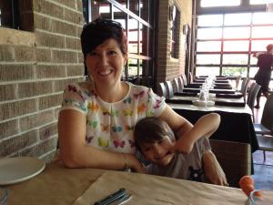 Hugh has started pre-K too so a big day for us all.  To celebrate the start of a new school year we took them out for lunch yesterday.  Now I have to say we took them to one of my favorite lunch locations – Pizze Fritte – and yes Poppy doesn’t like pizza – so I guess it was a tad unfair, but I also claimed the lunch as my early birthday lunch before Friday – hence the 2 glasses of prosecco…at least Poppy enjoyed her fries:) I wore my Zara butterfly top and blue pants, which can’t be seen here but needless to say I felt very colorful!  Notice how they put families with noisy children in the far corner away from the other patrons…or maybe that table is saved for families with noisy mothers?