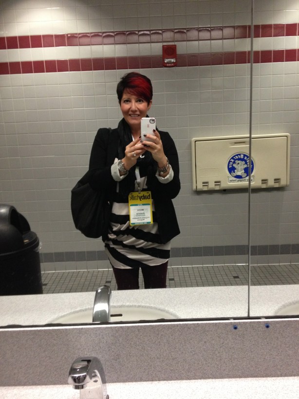 I was rubbish at taking my outfit of the day photos – which is madness really as they would have been fun with a great mirror, well thought out packing and no one trying to get me out of the house quickly – but I had other priorities!  I did get some fun shots of the party animal that I am though…On the first evening I wore my AllSaints Dita t-shirt dress, Zara bordeaux skinnies, Zara jersey jacket and my Rag & Bone Newbury boots.  Here’s a photo from the loo in the exhibition center – people really do think I’m weird when they catch me photographing myself!
