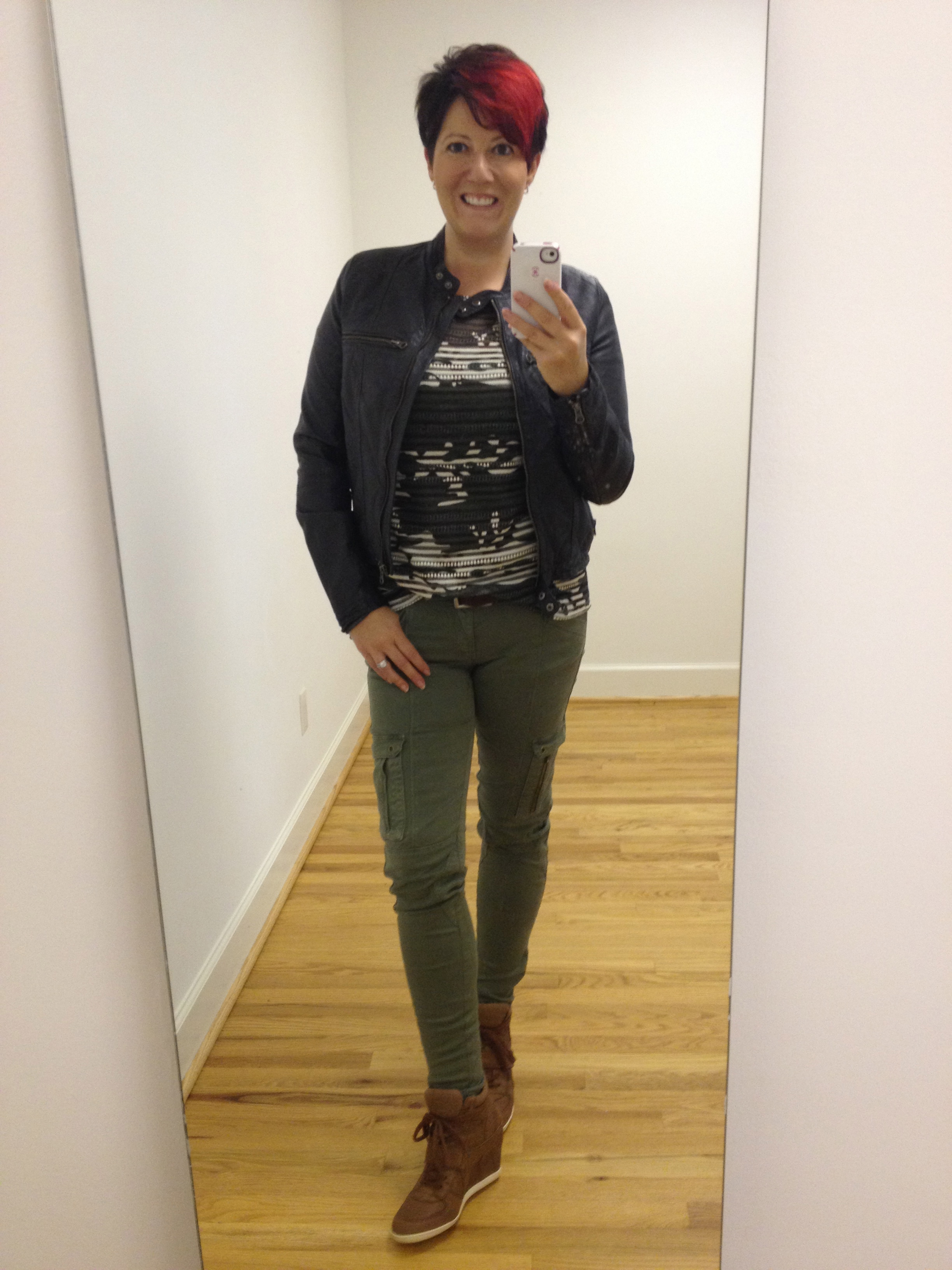 Today I’m just about feeling human again so managed to pick out something other than sweatpants from the closet.  These are Zara cargo pants which I love – really comfy with lots of stretch, a Zara camouflage top, JohnnieB leather jacket from a couple of years ago and my Ash Bowie sneakers in camel.