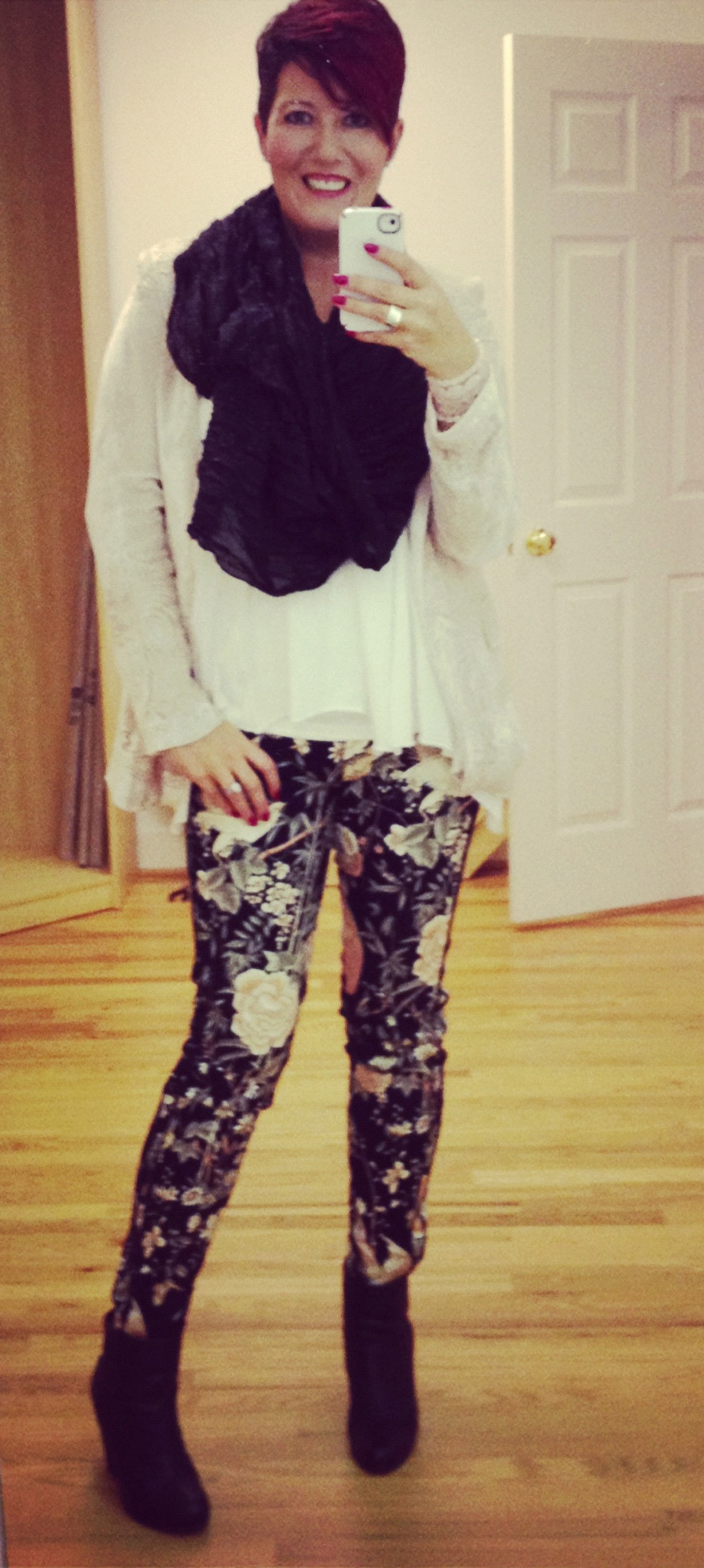 My cold has probably been exacerbated by the crazy weekend we had. What with swim meets and nights out I think my energy levels are low. As I’ve been ill I will admit to having a couple of days off from ‘getting dressed’ – as we speak I am still in my pjs:) Saturday night we went out and I wore my Zara oriental trousers, AllSaints tank, Zara silk velvet jacket and my Newbury boots – the scarf is an old H&M. Just about getting used to styling my hair – what is left of it!