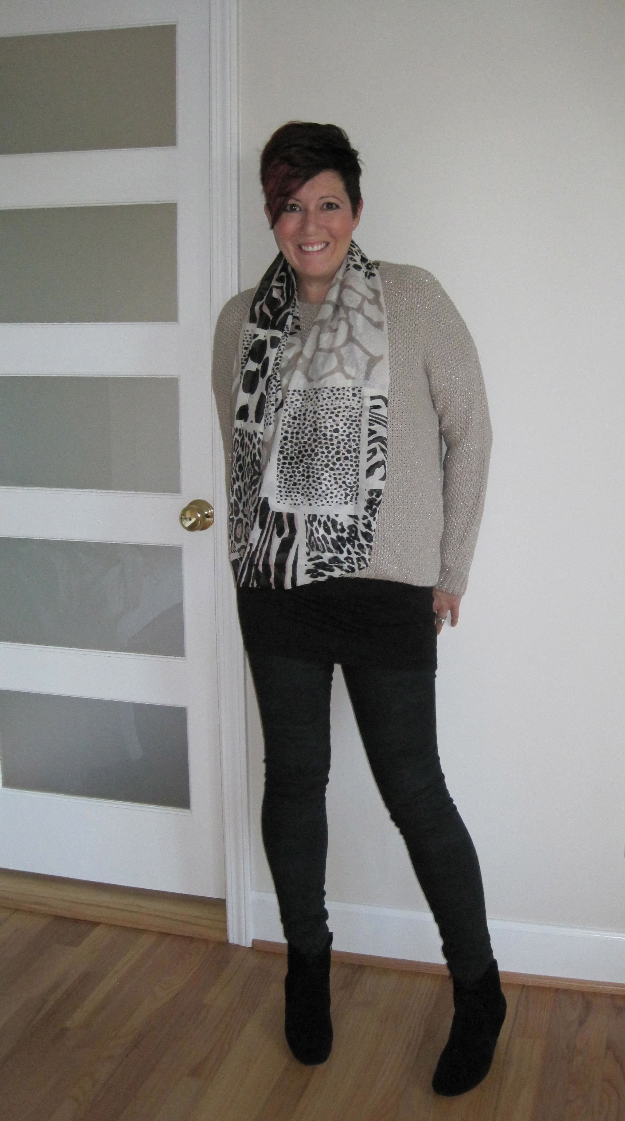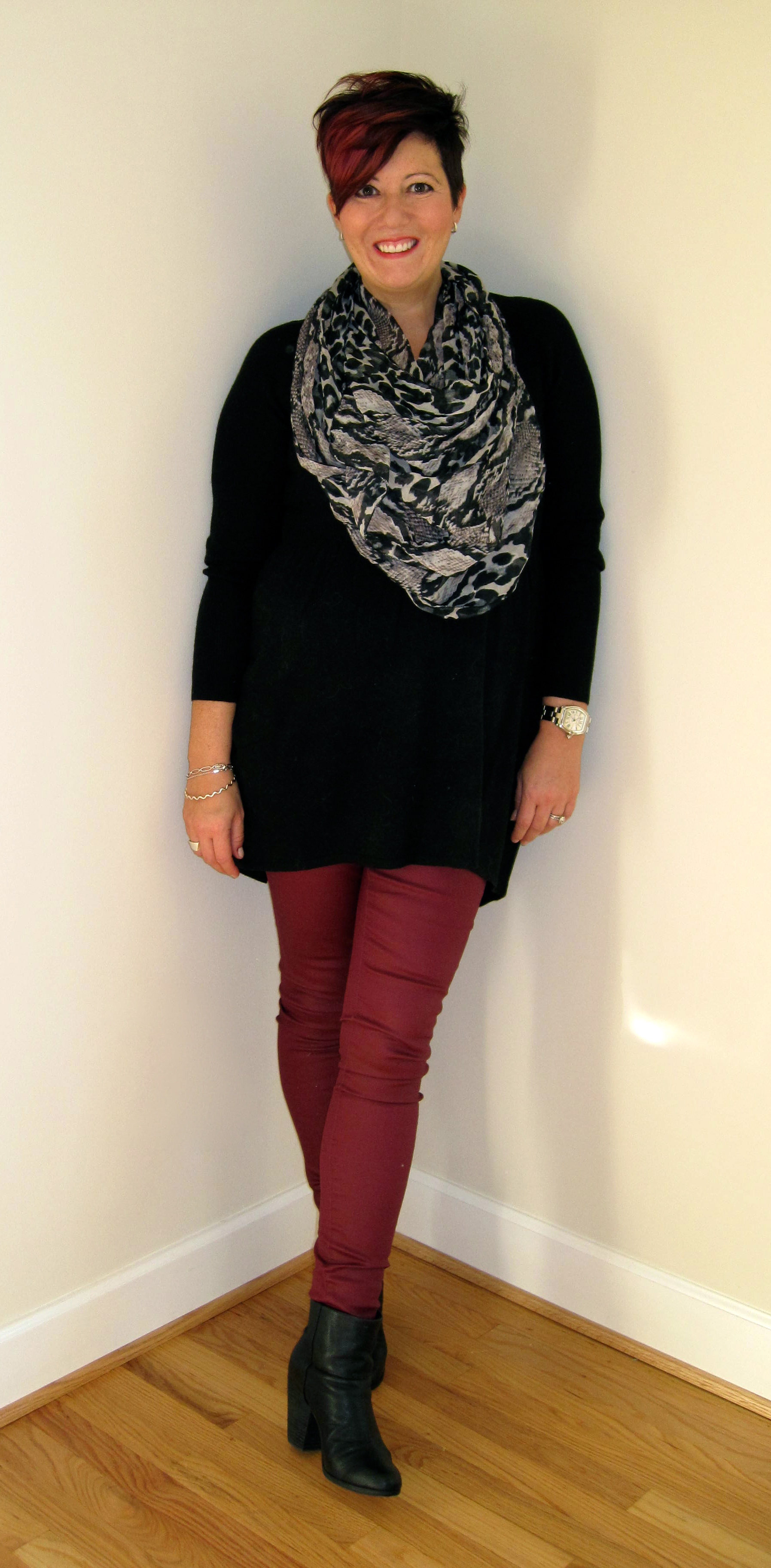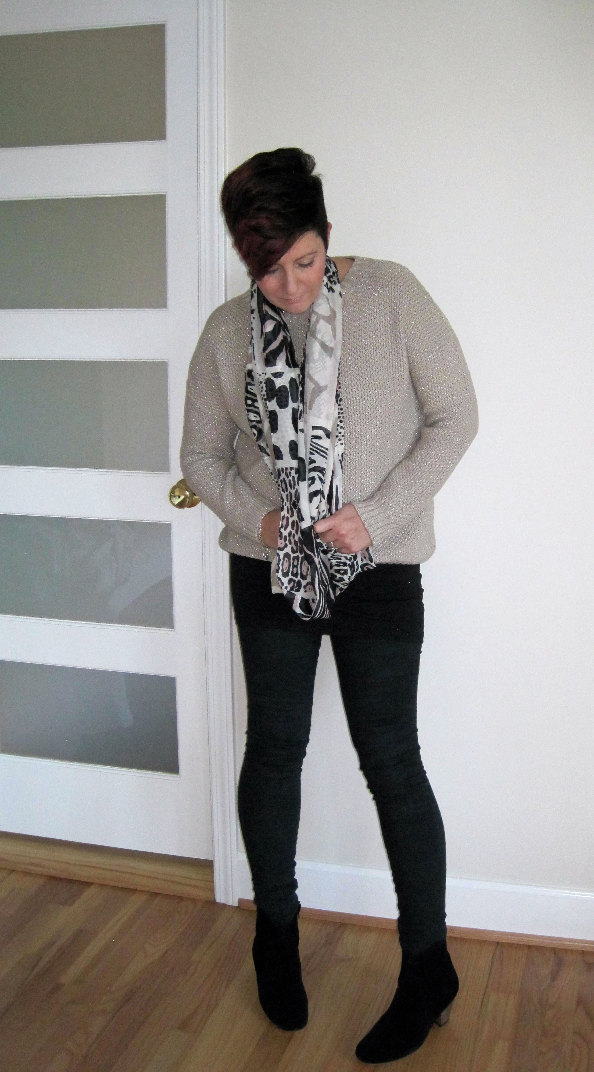 Trying something different today – I do like my skinny jeans though:) I used to wear knee length boots all the time but ankle boots definitely seem to be more flattering on me…I think!