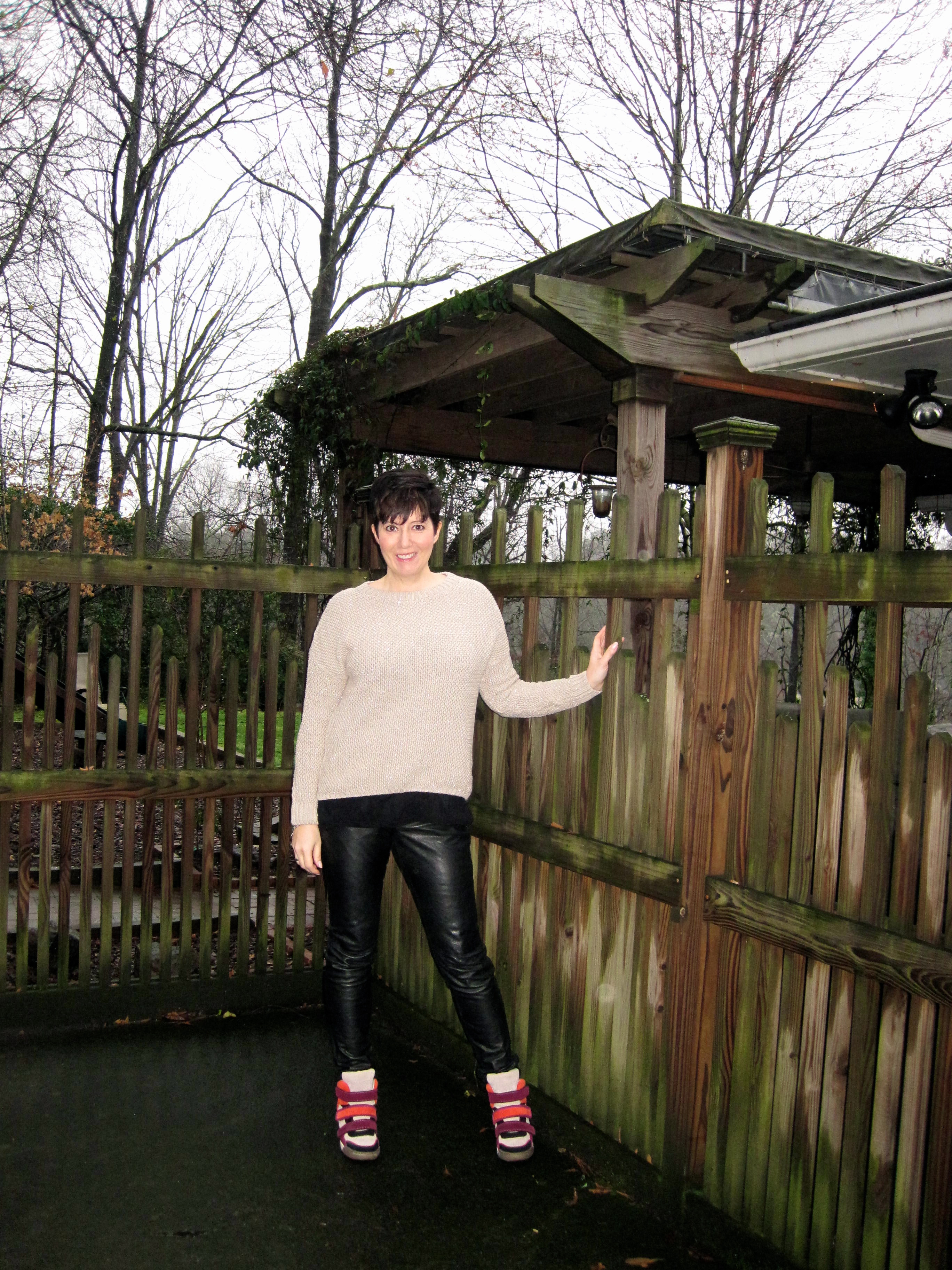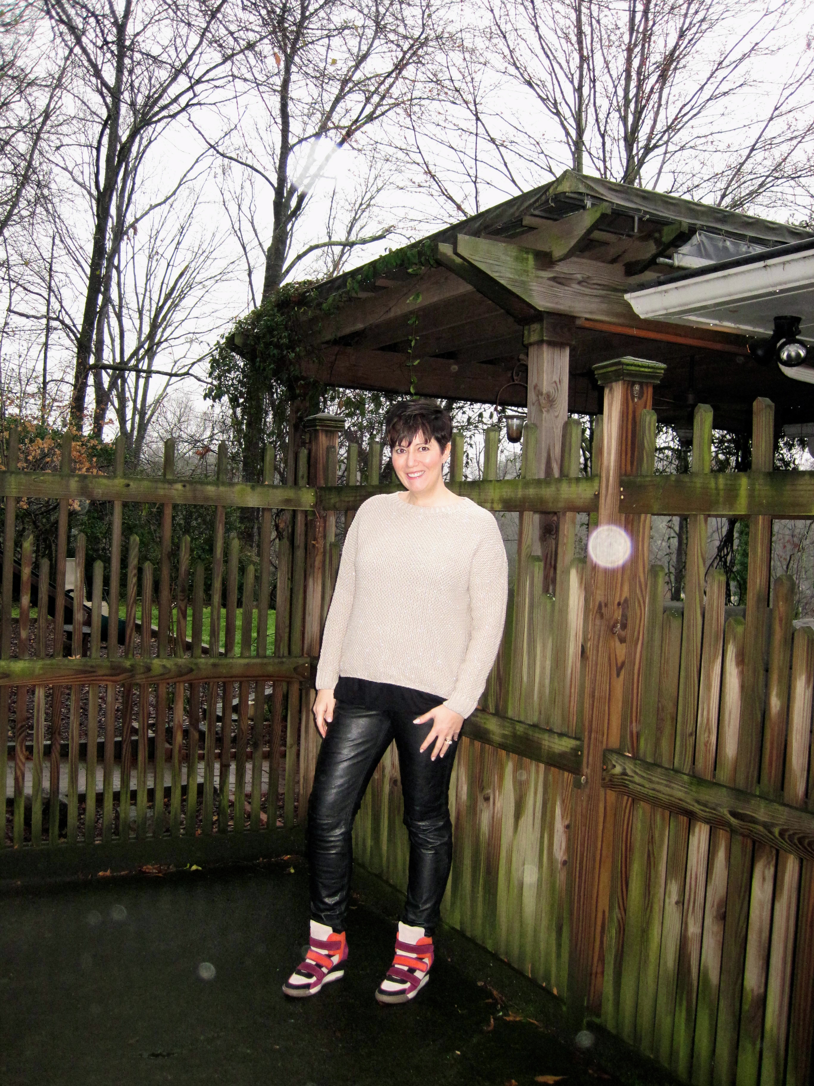 It was a tad dreary this morning – and I wanted to wear a snuggly knit.  Also, I have decided that my AllSaints leather trousers need to be worn for everyday wear too – they were being saved for ‘best’ and therefore hardly worn.  They are actually really comfy and warm – I love them with sneakers and a jumper.  The Boden sparkle Skye jumper is perfect – and there are still quite a few of the regular versions in the clearance.  You might want to size down if between sizes though as the fit is loose.  I’m wearing it over a Forever21 color blocked top – mainly because it was close at hand this morning.  Of course the sneakers are the Ash Alex.  Sorry about the raindrops on film – not sure I had the right exposure considering how dark it was!
