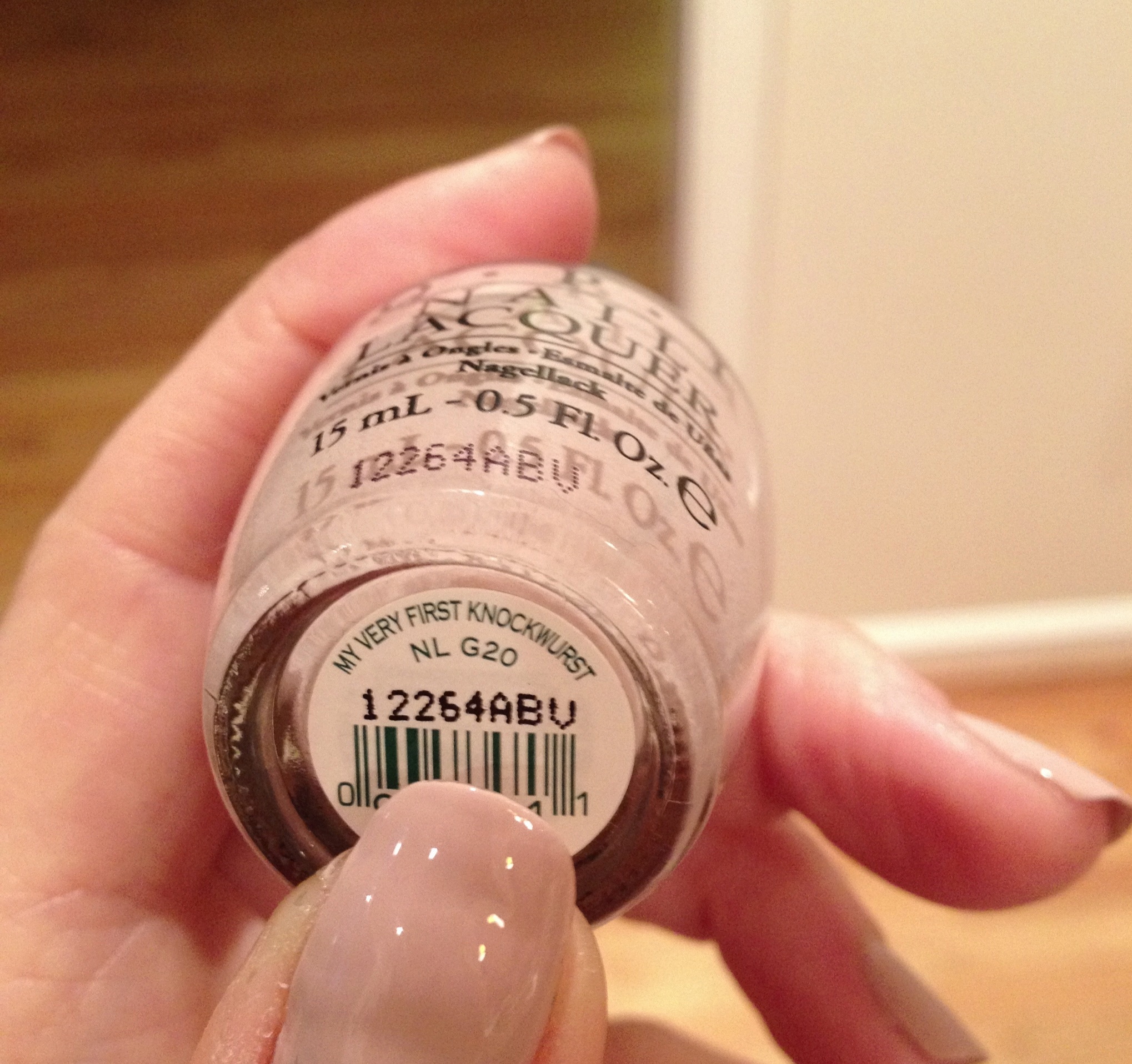 I was picking up a few things for friends and family yesterday.  One of the most requested items funnily enough is nail polish.  OPI is half the price here.  Mum wants A-to-Zurich and Sue wants Nein Nein Nein.  I’ve been 50% successful – will keep looking Mum!  Now, if I rate shopping for myself, I was 100% successful and I got myself a new favorite polish.  I like nudes but some of them make my yellowy skin tone just looked so washed out when I haven’t had any sun.  I found this one – My Very First Knockwurst – it’s a lovely grey nude and as ever it goes on beautifully.  Still need to sort out my cuticles though – this darn weather plays havoc with my hands!