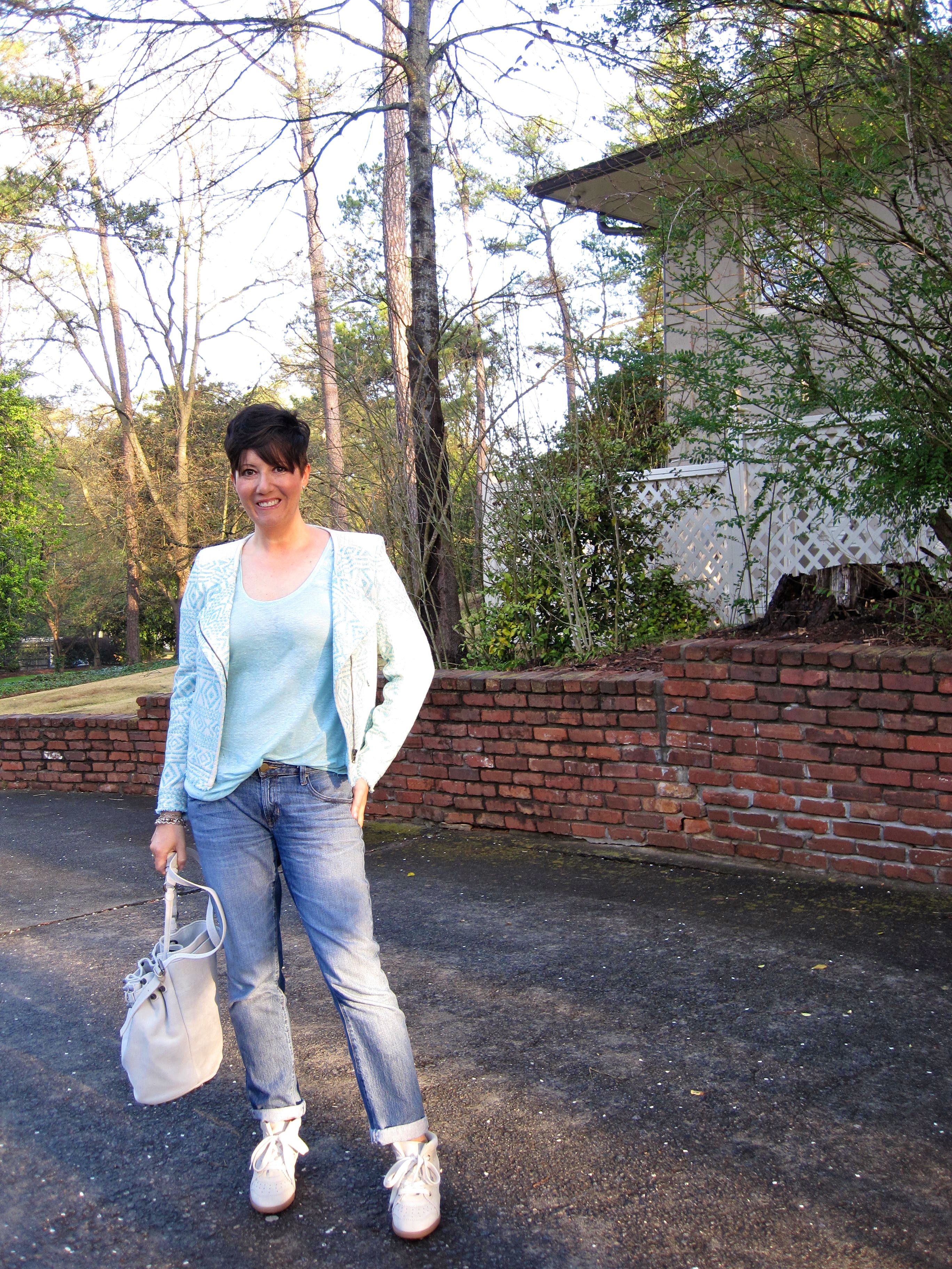 your outfit looks fab! I always love light blue jeans in combination with white and mint green.