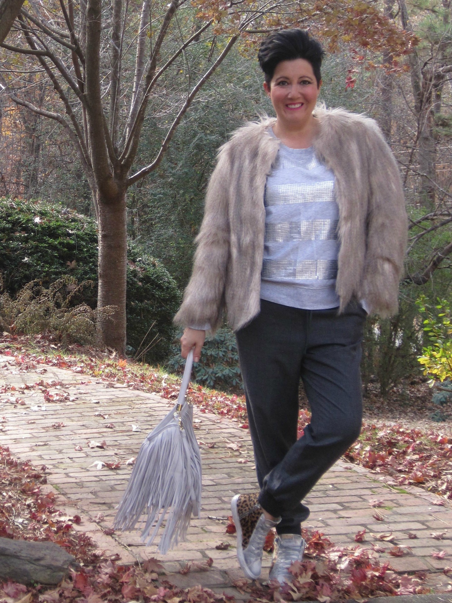 Sneakers – Golden Goose (on sale here) // Trousers – J.Crew slouchy wool jogger // Sweatshirt – Target (old) // Fur – Zara (currently in the Cyber discounted section!) // Bag – H&M (old)