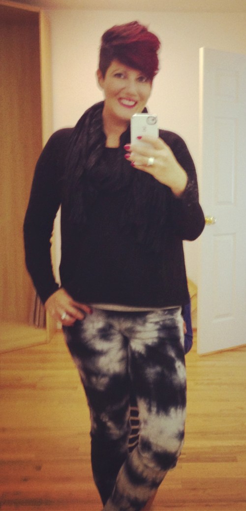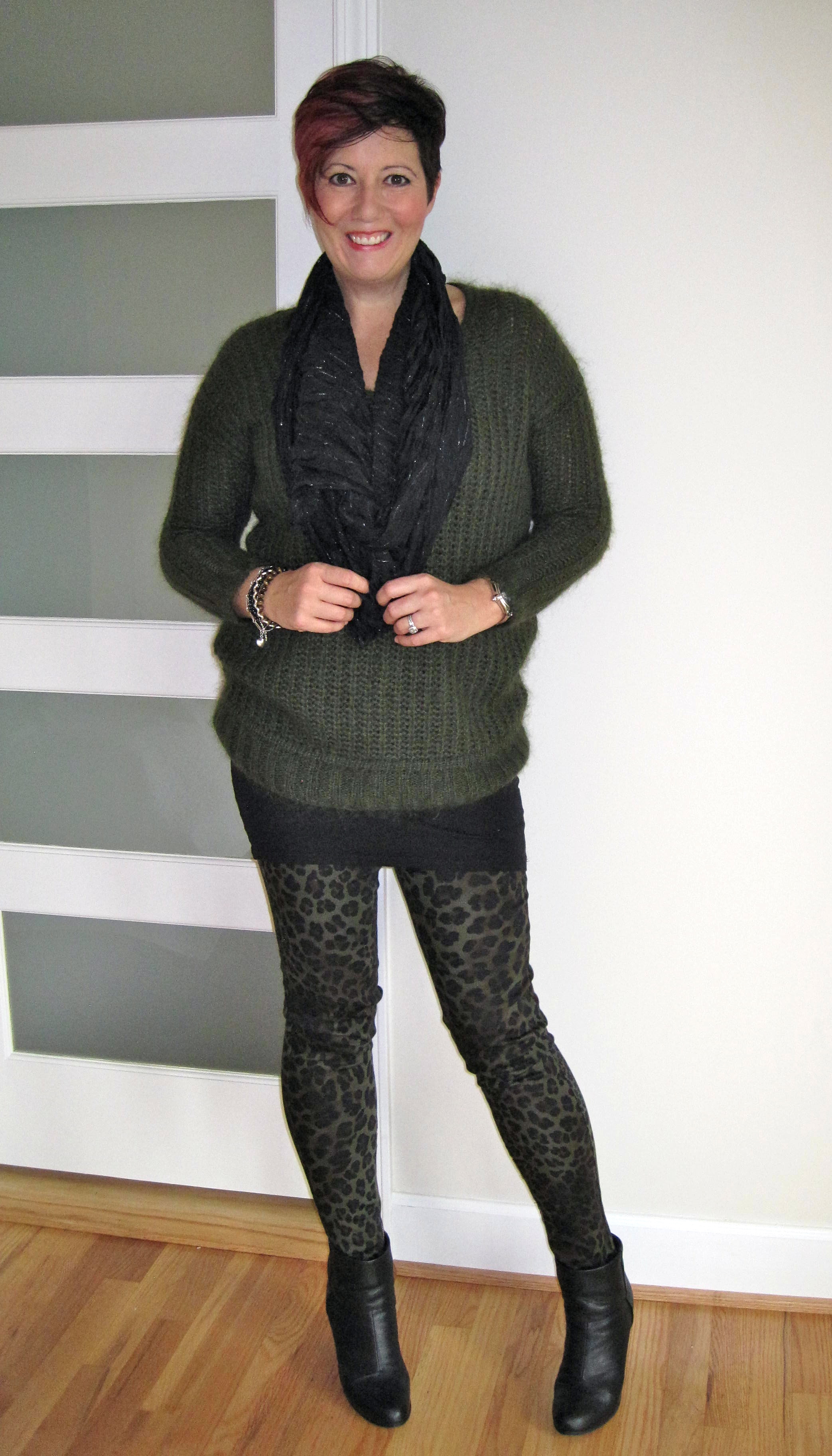 I wore my Zara leopard print khaki pants and khaki chunky sweater (not found online), with a long line H&M black vest dress layered underneath. The boots are my fabulous Newburys and the scarf is also H&M.
