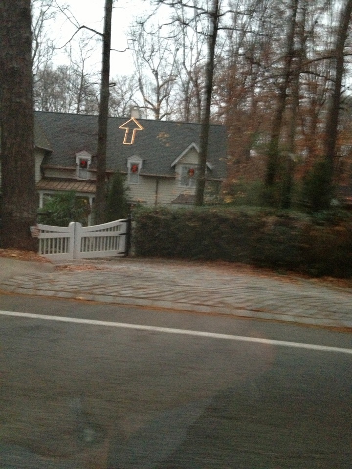 Every year we add to the list of our Family Traditions at Christmas. In recent years a tradition that has become more and more popular, is to head out for a drive after dark and take a look at all the wonderful National Lampoon style Christmas lights that adorn the houses around Atlanta. It’s a bit like our version of the Blackpool Illuminations that Mum and Dad used to take us to see years ago:) This year it seems our neighborhood has significantly upped their game. A little friendly neighborly competition maybe? There are Antebellum columns wrapped as candy canes, herds of deer lit up, and several Santa legs sticking out of chimneys. One of the easiest (if you don’t mind heights) to set up, and most fun was spotted this morning on our school run – I was in the line for the lights – don’t worry no hands free driving here…just so Santa knows where to go…