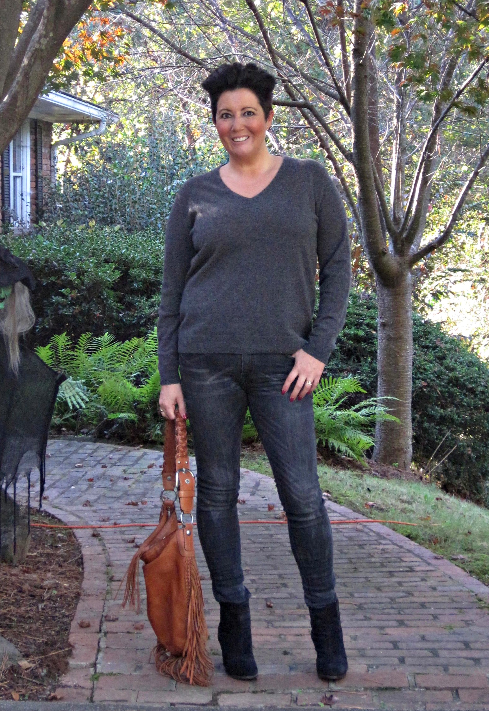 Today is very much a dress down Friday after a few glasses of wine last night to calm the nerves:)  Also – very manky – but I wanted to keep my piercings dry for another day to help with healing so I didn’t wash my hair – that definitely made it a hat day!  The jumper has to be the BEST cashmere sweater ever.  It is a men’s Uniqlo crewneck size Medium.  Perfectly soft and slouchy.  I want one of these in every color – this is the dark grey.