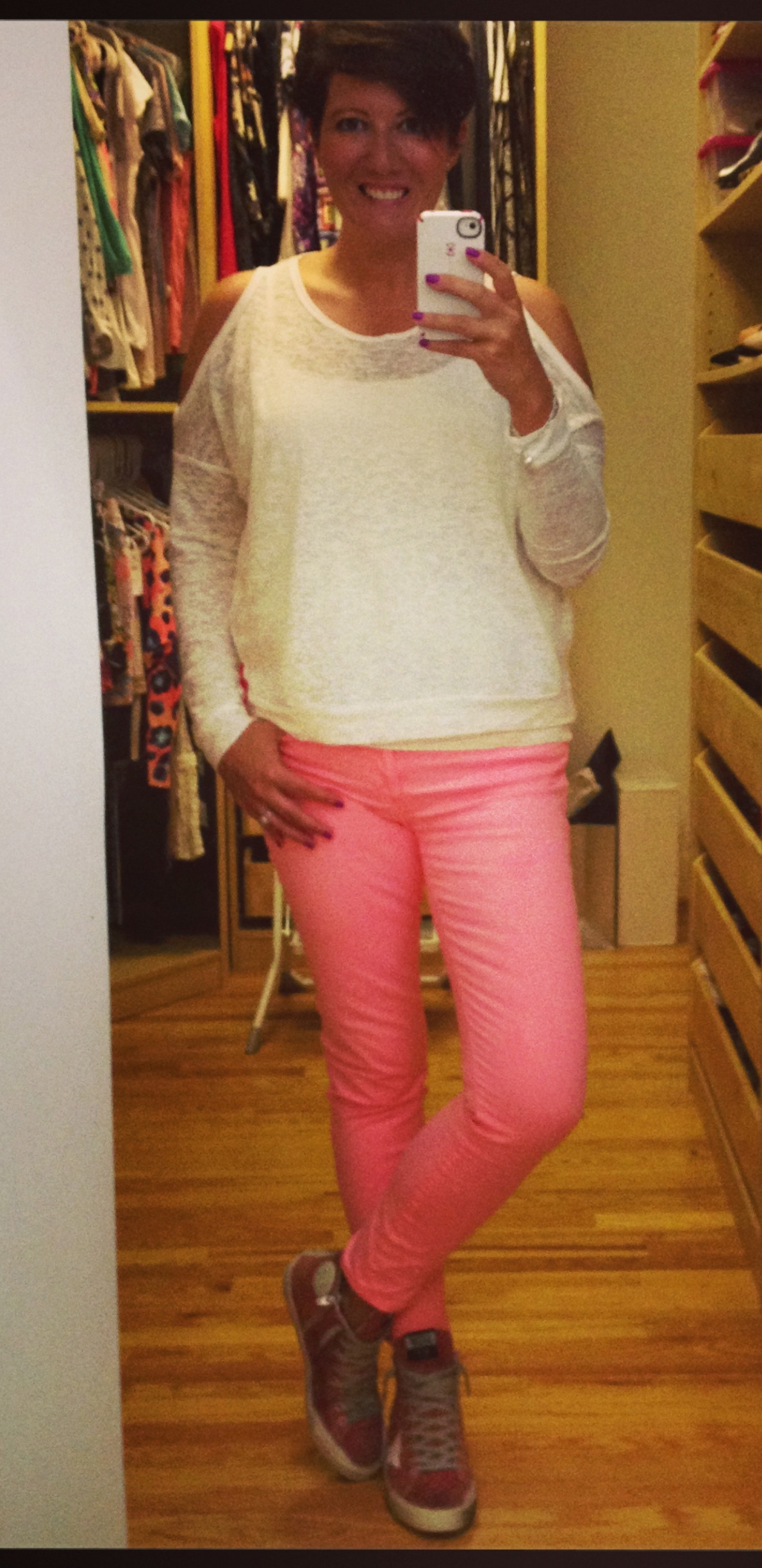 It’s hot here but last time I wore shorts to the Braves game I sweated like a very sweaty thing on the plastic seats – nasty – I walked out looking like I’d had an accident…so today it’s neon jeans in an effort to stay cooler, or at least drier on the plastic seats!  The planning that goes into an outfit can never be underestimated!