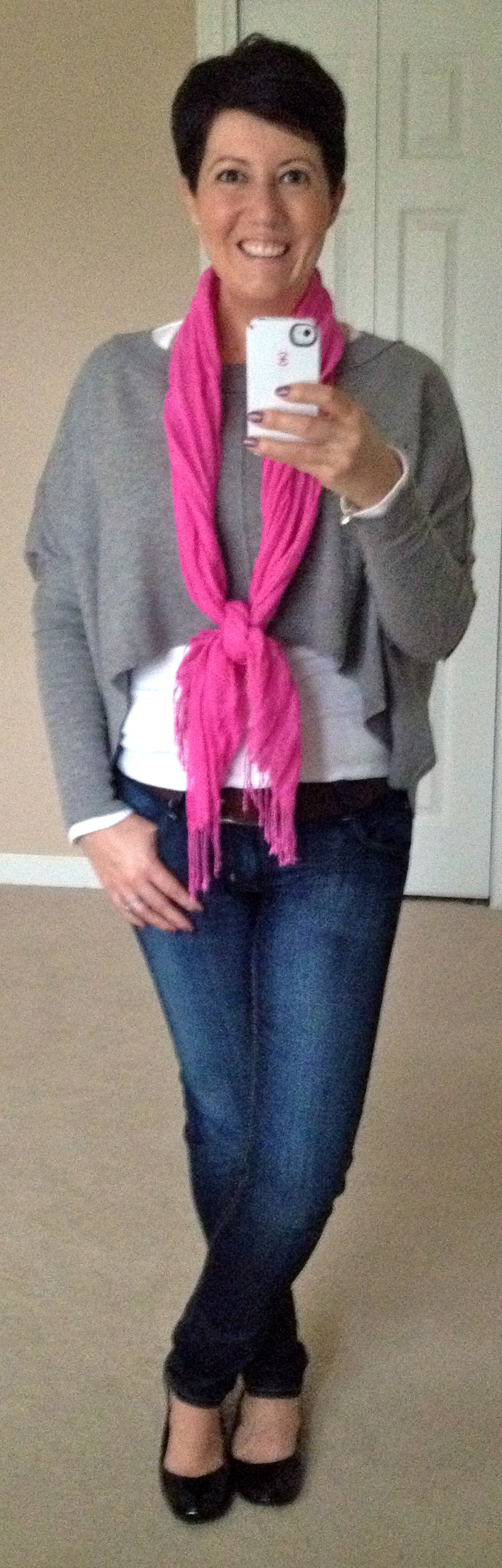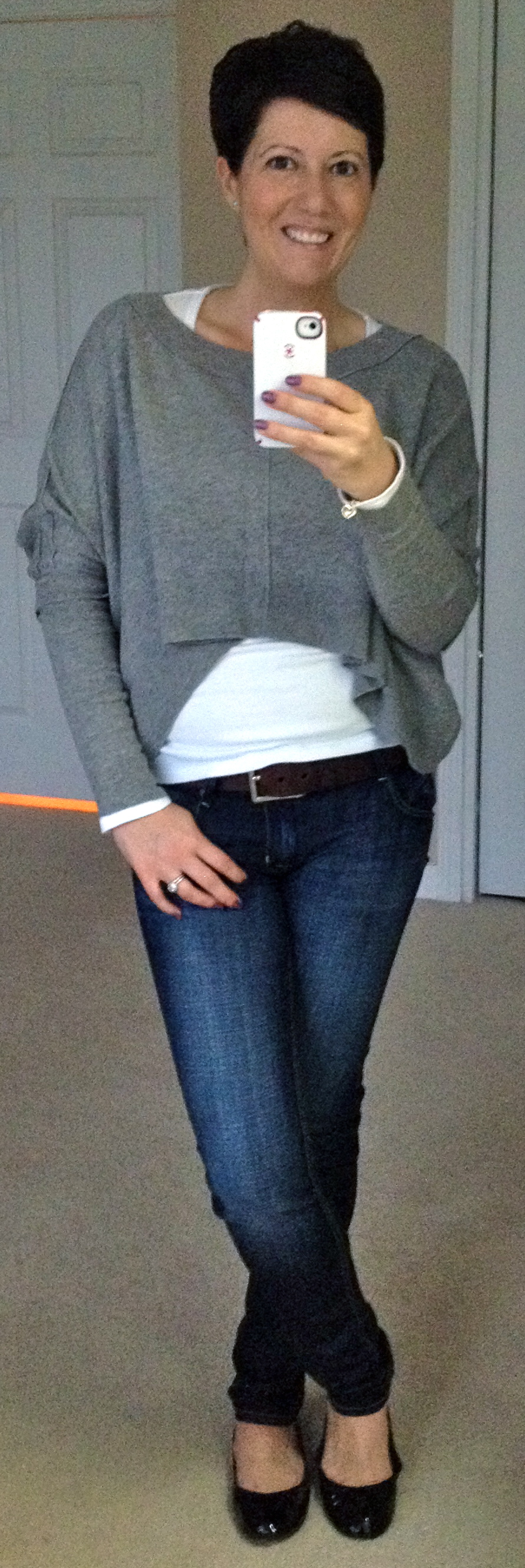 As I was leaving the house to take her and her friend to the party I decided it just wasn’t cool to go in my worn out gray sweats so I popped on my lovely reliable Boden Easygoing tunic which is currently on clearance at $49. I have to say this normally wouldn’t be my style at all but I ordered it on a whim in the sale based on my love of all their tunics and I thought I should at least try this one. I put it on and it really is the easiest thing to wear. Worn as a dress, or over leggings or tights, it is so comfortable and I love the pockets. It does verge on being a ‘smock’ so you definitely have to be careful with how you style it but I am very happy it is in my closet for these early spring days when I want to go bare legged. I’m wearing it here with my navy Tory Burch Eddies.