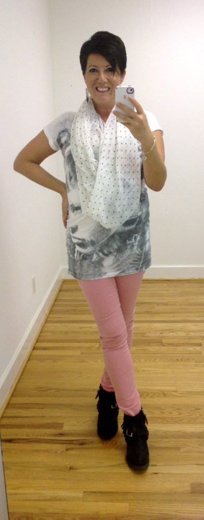 As it is past Labor Day now I think can get away with wearing light weight long sleeves and boots so today I am wearing my Express blush Zeldas, a Zara zip back top from the sale that was only $15, my H&M scarf, which only when I came to wear it for the first time today did I realize that it was actually a snood, all polished off with my Ash Thelma wedges which are coming into their own in the wet drizzle that Isaac is leaving us with.