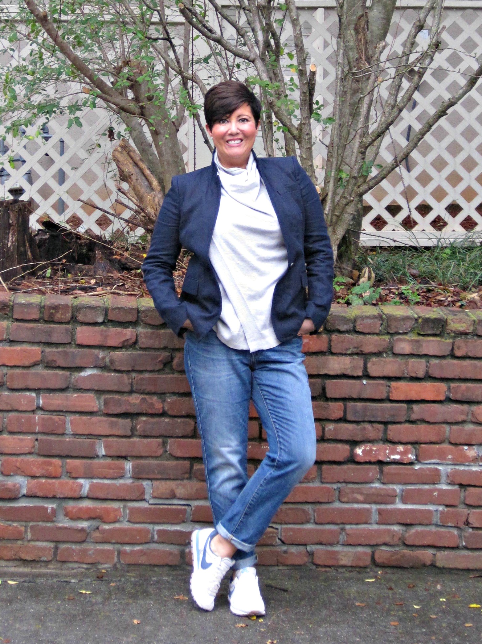 Blazer – J.Crew // Sneakers – Nike from J.Crew (similar here) // Jeans – J.Crew (currently on sale) // Top – AllSaints