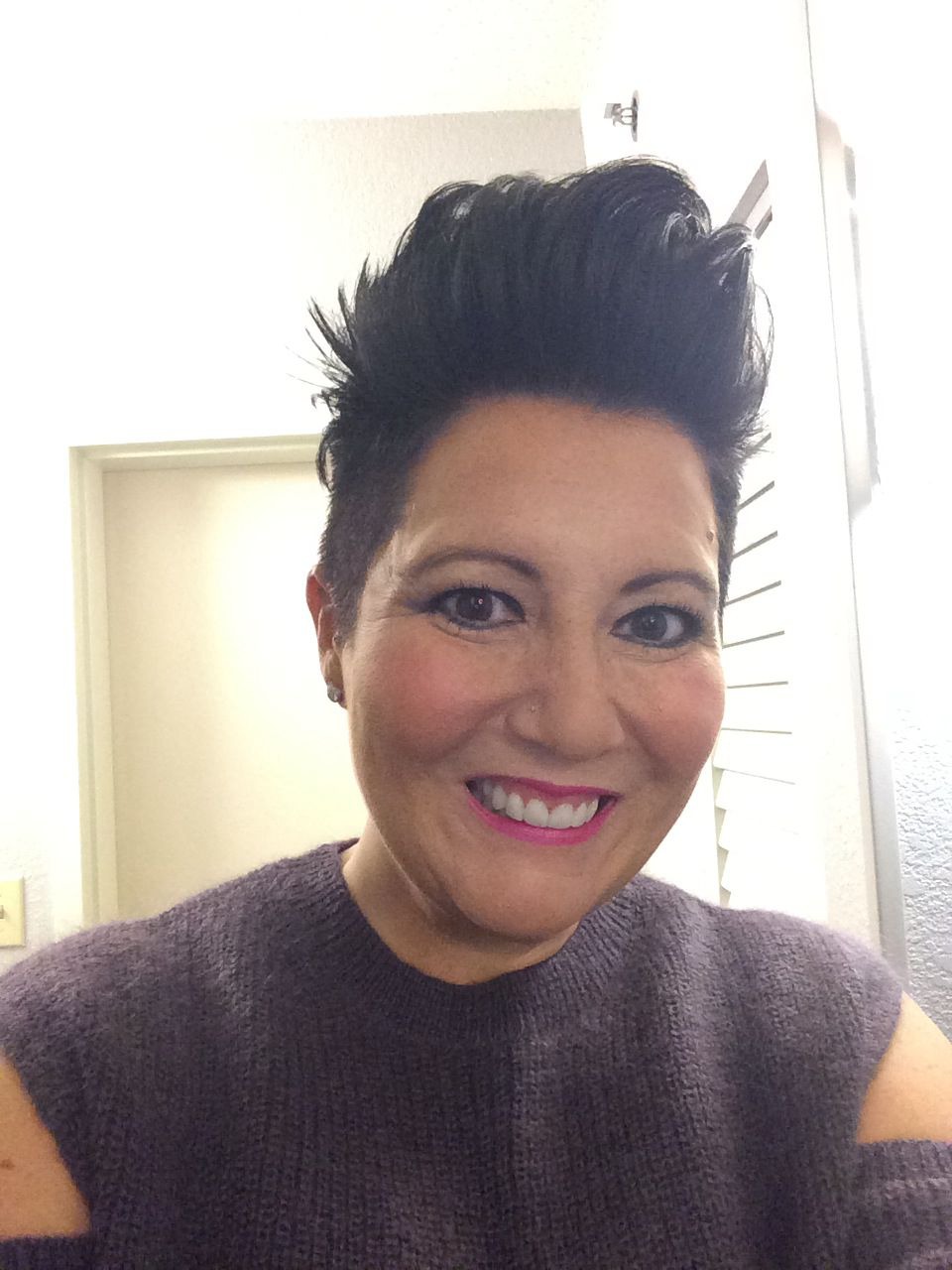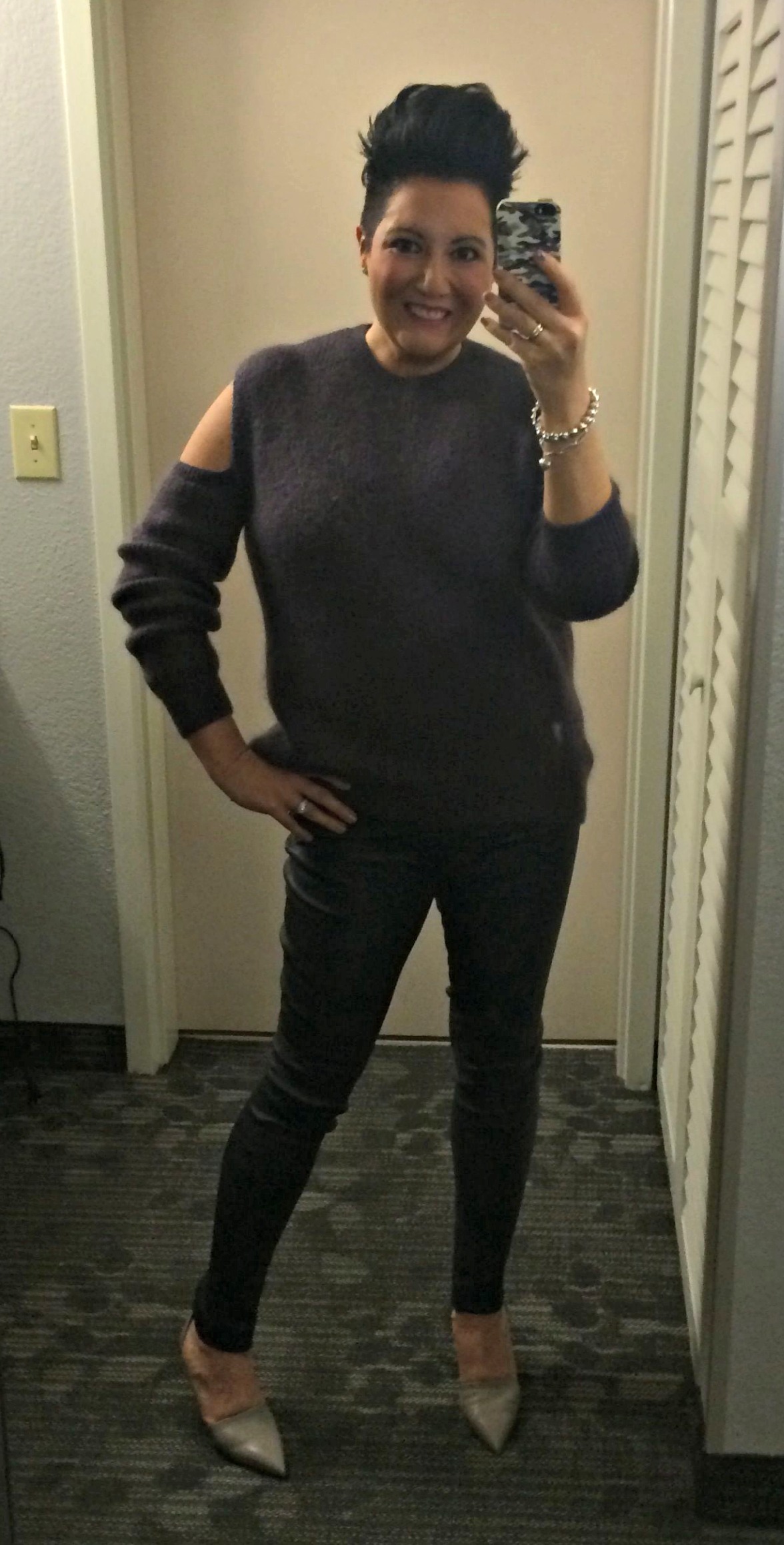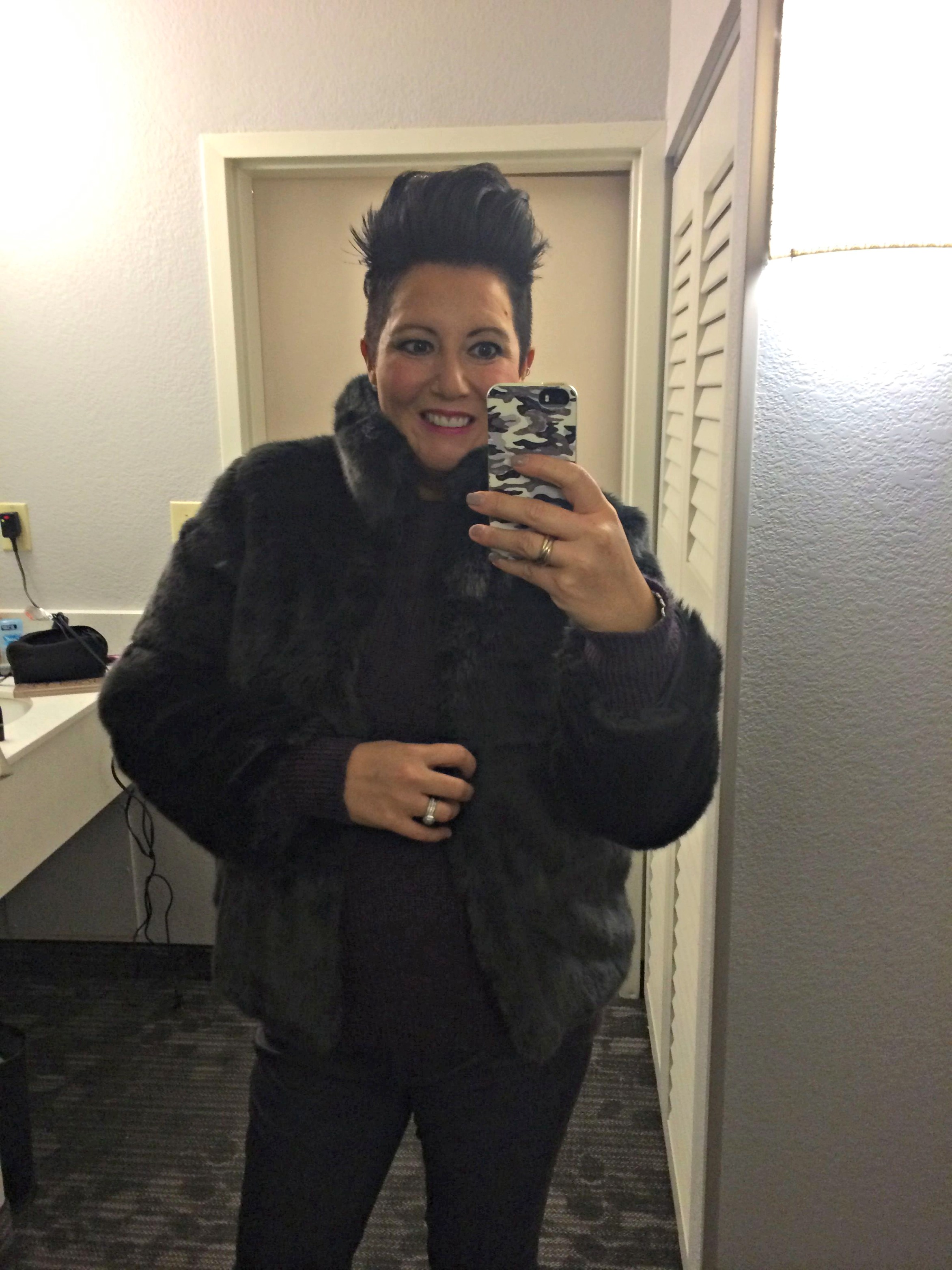 I was super excited on Saturday for the arrival of my Husband. The last time we had a night away together without the kids was for my 40th 3 years ago! This was long overdue! I wore my AllSaints Haff sweater, Theory leather leggings (mine are midnight blue but TheOutnet.com also has them in black now!) and Vince Claire heels in woodsmoke. The lipstick is Mac Snow Orchid. My Husband delivered a new jacket for me too! The Zara fur in charcoal – I adore it – a perfect color! It fits small and I have the Large.