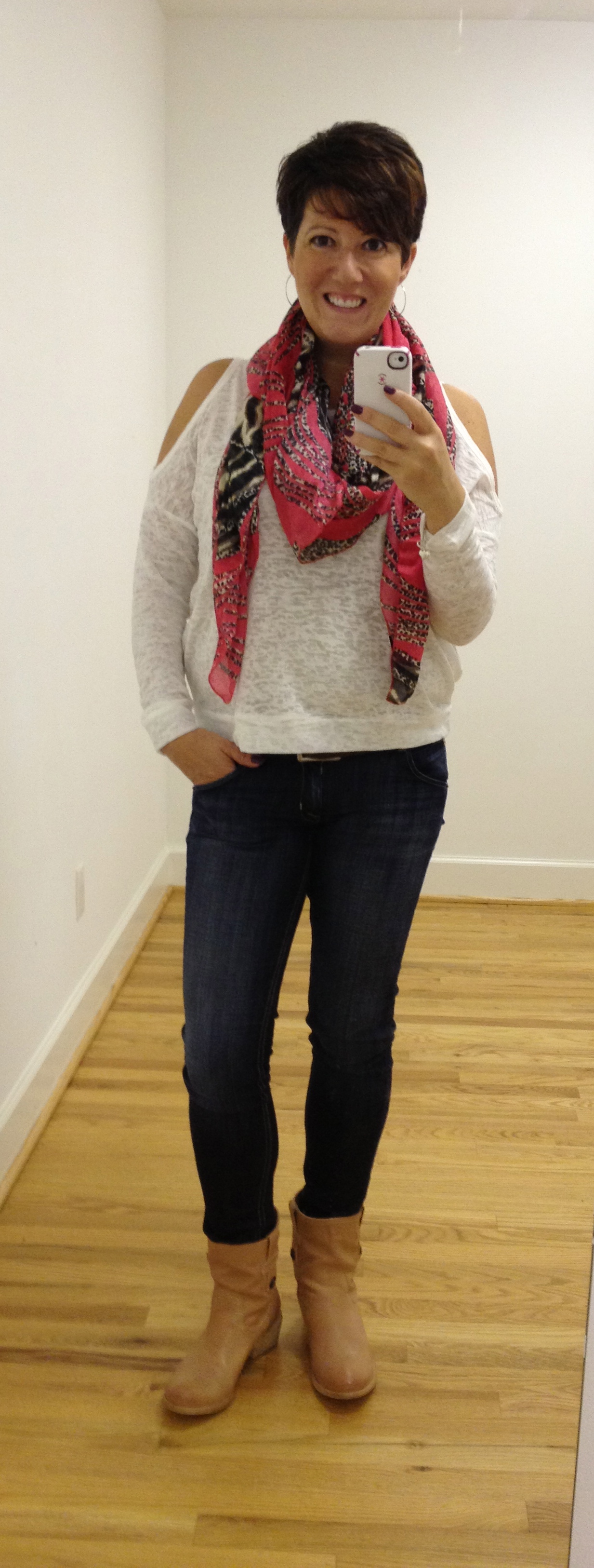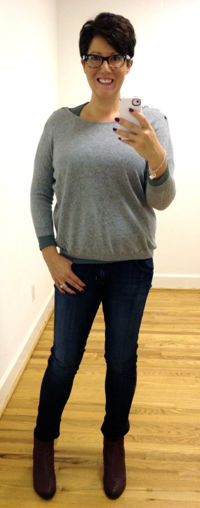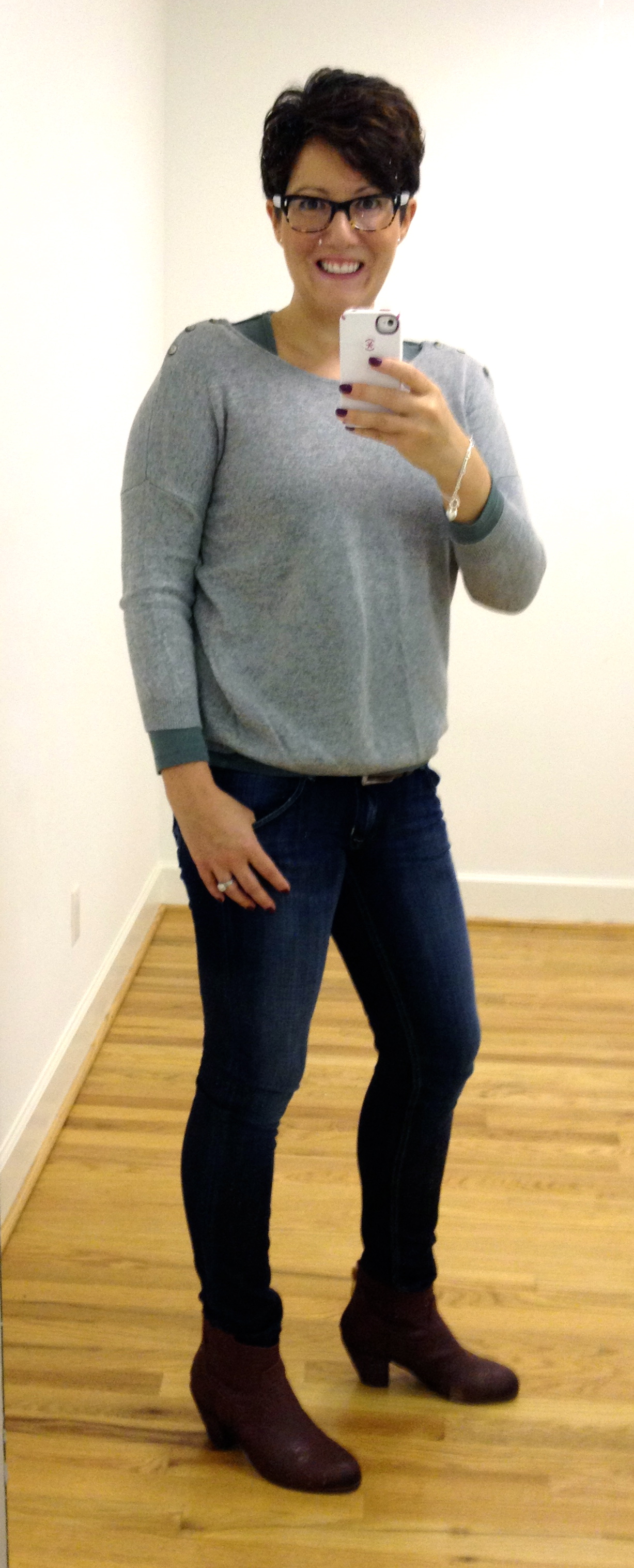 Braving the rain today I opted for a pair of my Frye’s. Don’t panic there are no leather soles here and all I’m doing is walking from the car to the office – not enough exposure to warrant the Hunters. These are the Veronica Slouch and they are a gorgeous dark, nutty brown – is that a good description? Maybe not. The jumper is one of my favorites from AllSaints – the Ellil in smoke. I love this jumper so much – the cut and drape are perfect and the buckle detail on the neck gives this knit a bit of edginess. I’m wearing it over an H&M vest dress for warmth – plus I find they keep some of the lumps and bumps at bay, working as a smoother or a shaper. The jeans are Hudson Collins. It’s five weeks since my last haircut and I’m desperate for one again – thank goodness I have an appointment on Friday – it’s feeling rather bouffant in this weather.