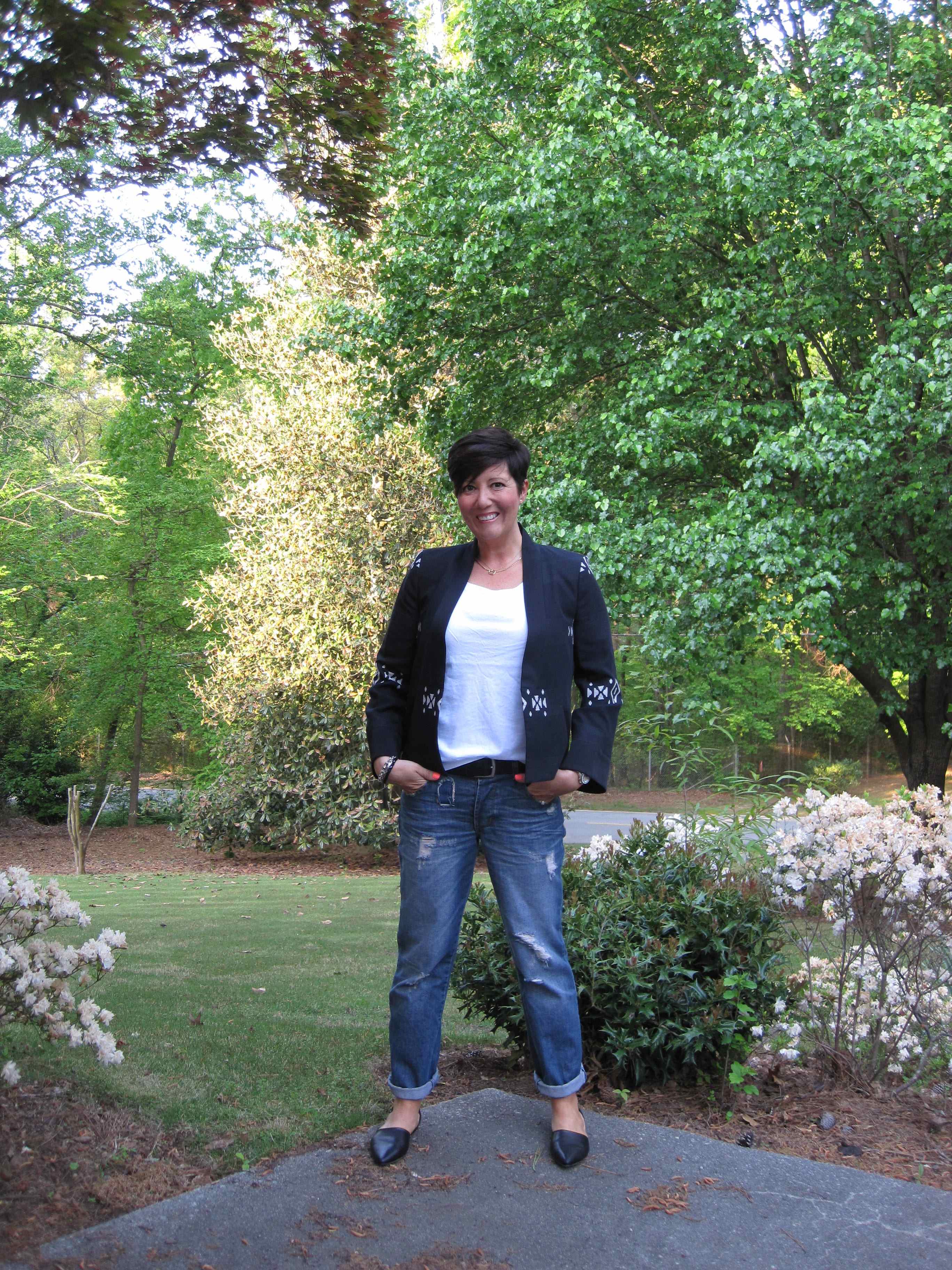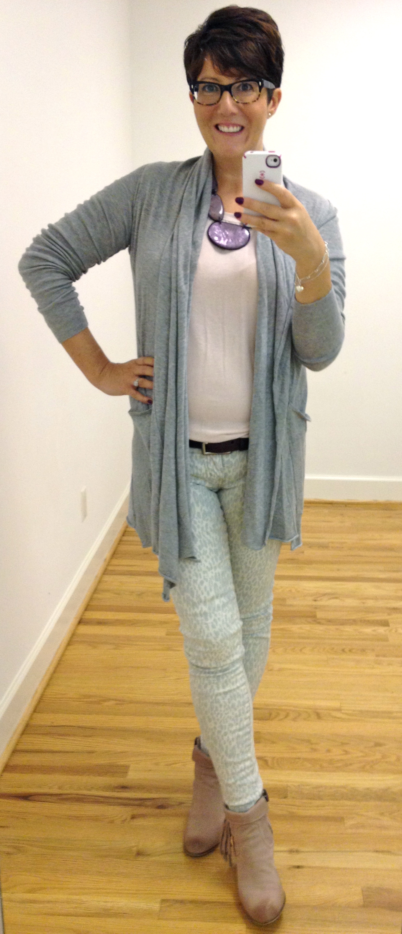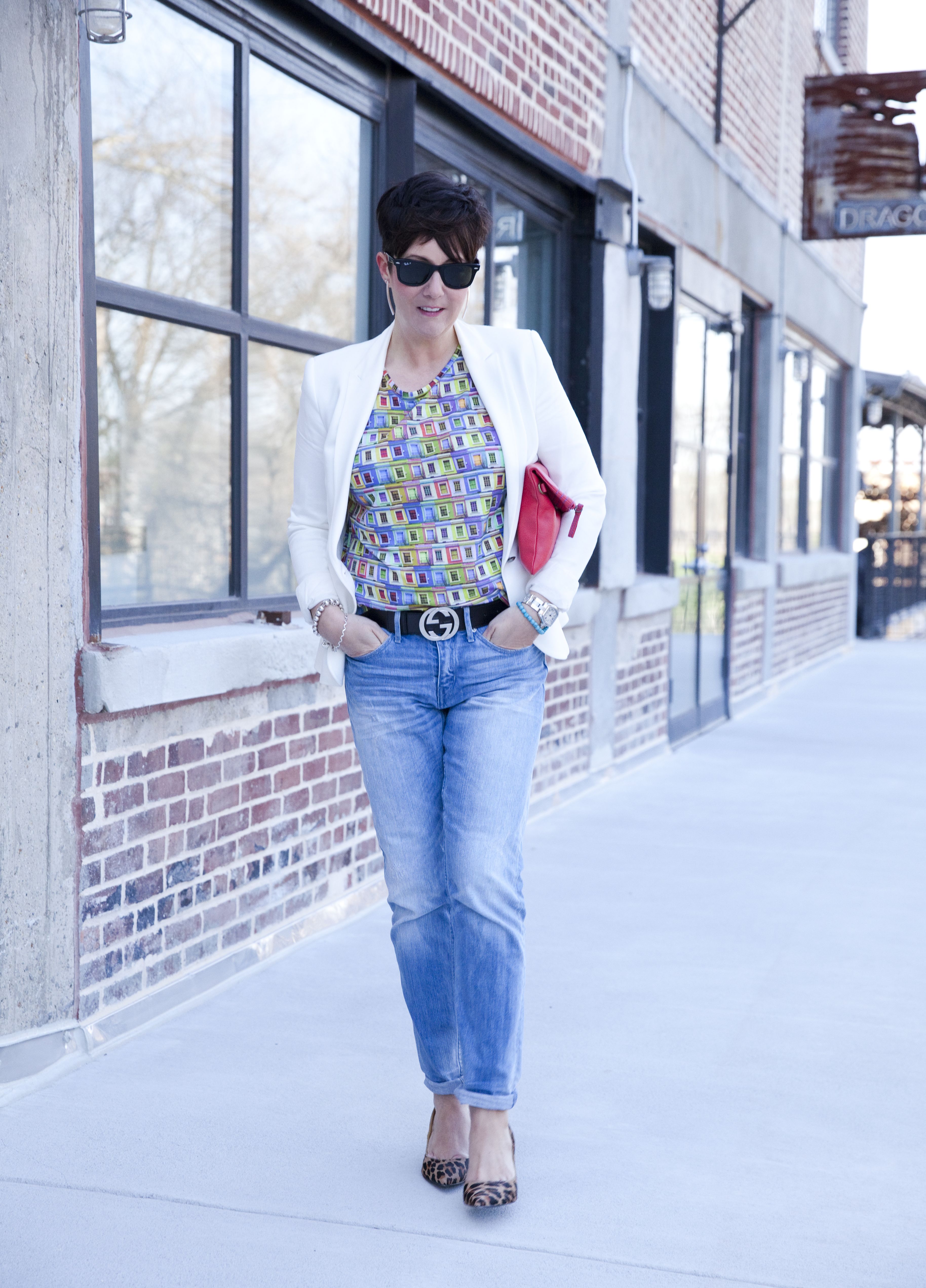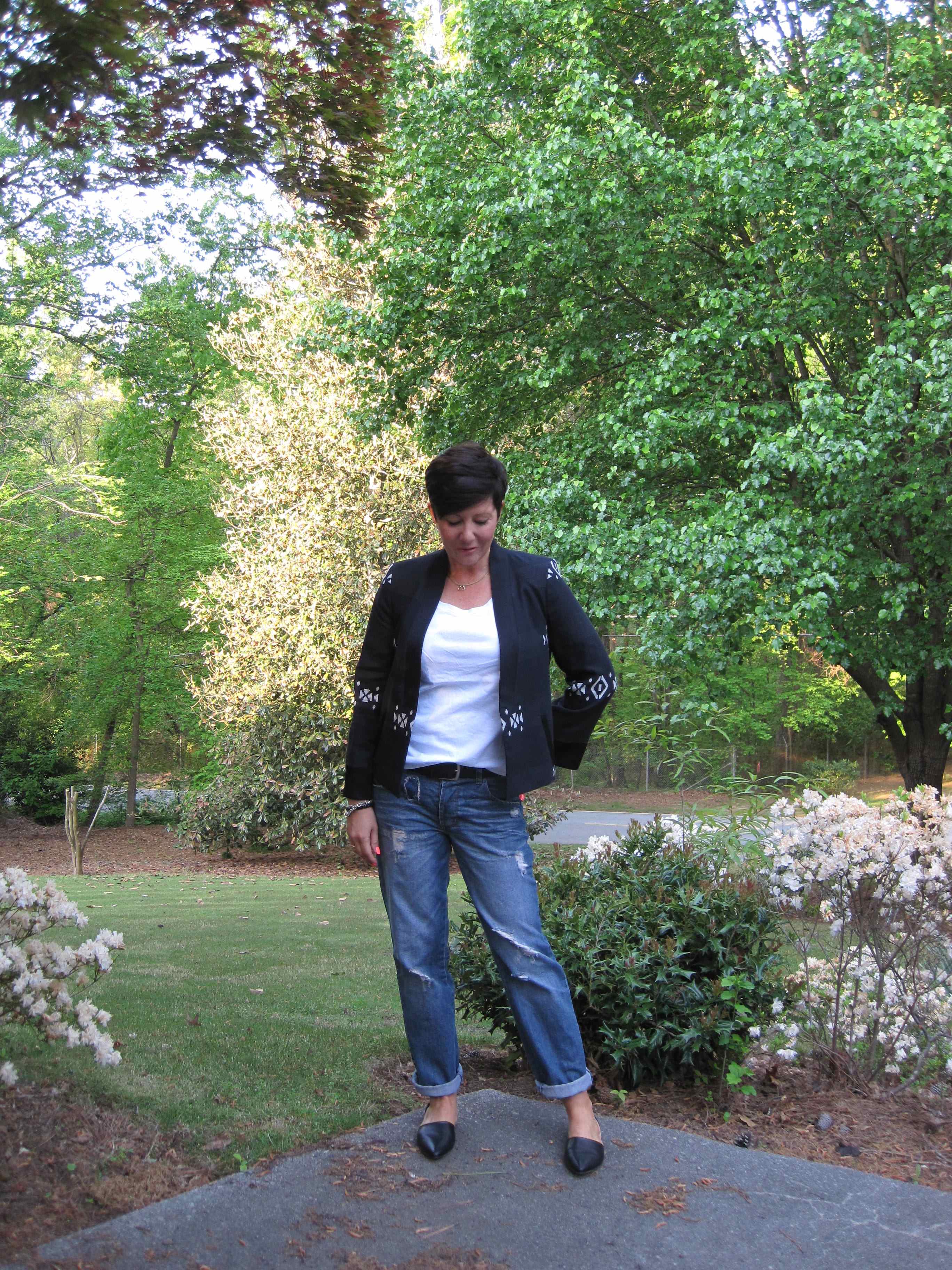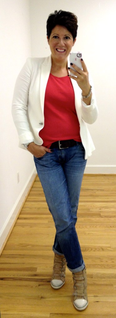 This is a case of poor preparation. I was planning to wear skinny jeans and then remembered I was having a pedicure later so I needed to wear a skirt, shorts or jeans I can roll up. I went with the jeans – but tried to substitute my distressed white skinnies from H&M for shiny white 501s and it really hasn’t worked – the proportions are all wrong. Even after a jacket change I’m still not happy. But after faffing around with photos etc…I didn’t have time to start again. So here I am. When it warms up later I’ll be taking my jacket off, and adding flip flops after the pedicure – a much better ensemble I think – and at least my feet will be looking good. I’m trying to distress these 501s slowly with a razor – I keep shaving threads off a couple of patches, hoping that with some washing they will split, but it’s not happening fast enough so I may just have to resort to the sandpaper trick.