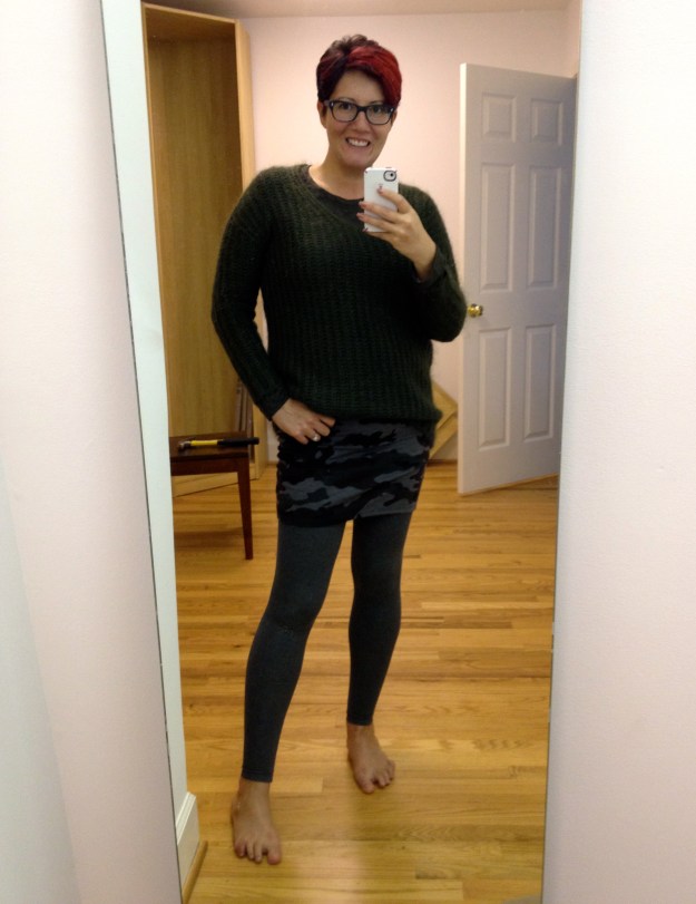 I plan to curl up with my new Robert Harris and snuggle with the kids while they watch ‘Shrek’ or ‘The Sound of Music’ for the 100th time.  Boden grey marl leggings are the order of the day with a new stretchy Zara skirt – I love my camo and Zara is providing buckets of it this season.  All topped off with a Zara t-shirt and comfy sweater – perfect for holding the sofa down.  It’s lovely going make up free for a day and I’m wearing my new Oliver People Wacks in matte blue havana.