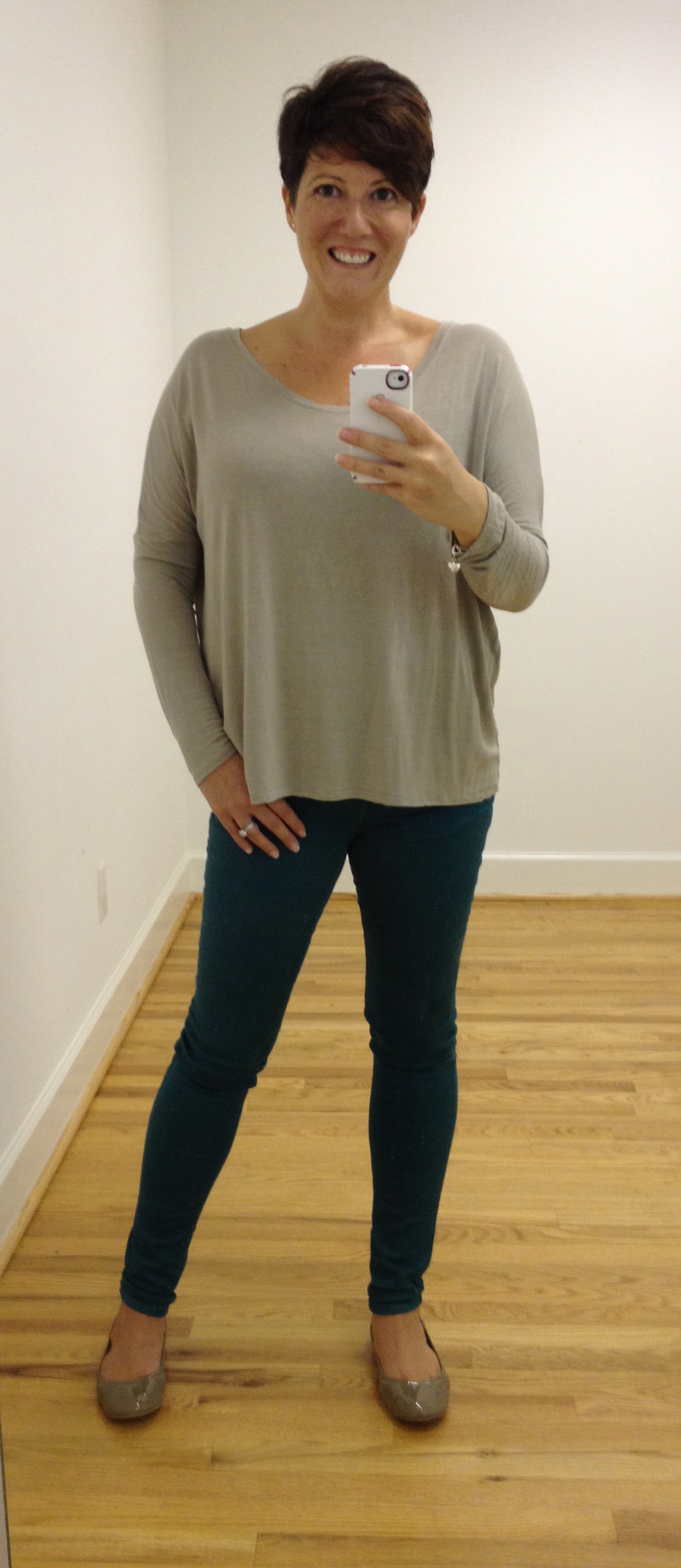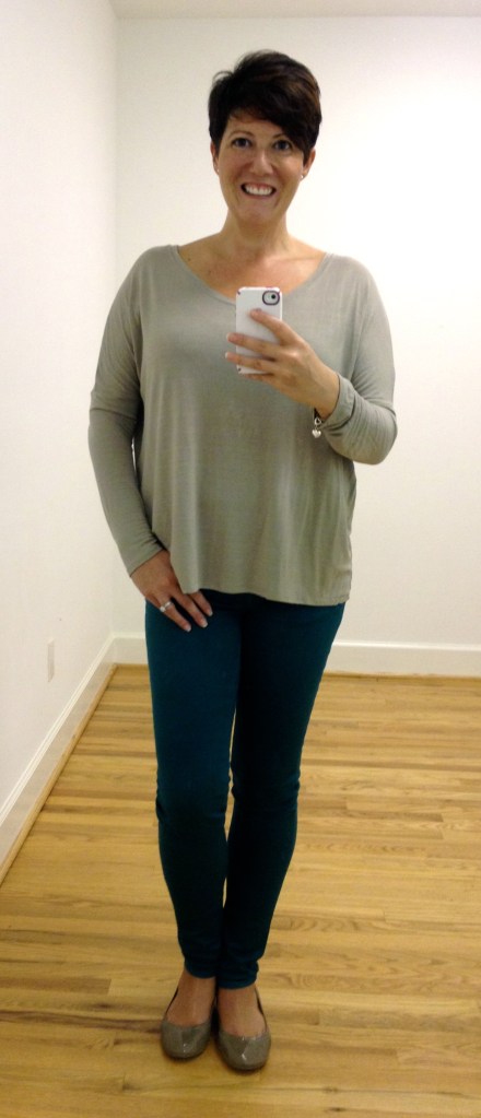 I’m wearing my Zara emerald green skinny jeans, a Zara top from the sale and my Tory Burch Eddies in musk.  I love these jewel toned jeans and they are the same cut as the red ones I wore the other day – absolute bargains for $35!  I think they’re quite a bit ‘greener’ than shown here in the photo:
