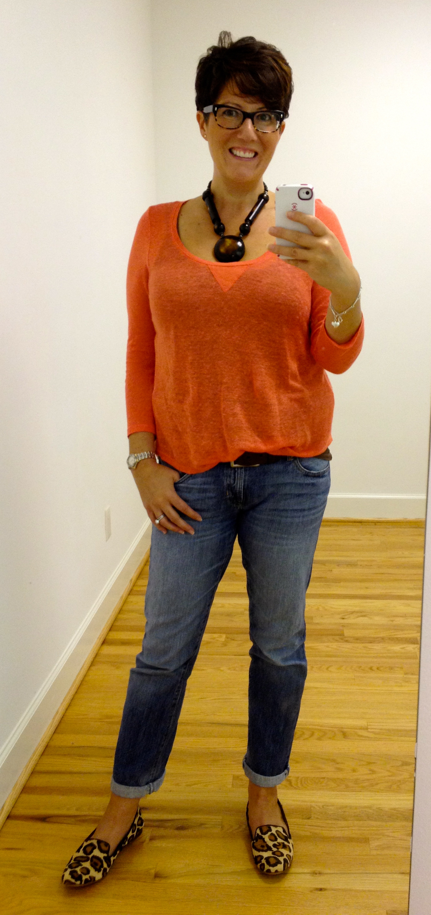 Today is a day for comfort – Gap boyfriend jeans, a Gap brown tank, H&M linen top and Sam Edelman Alvin loafers.  The necklace is an old one from Target but it’s fun and works well with the casual outfit.  The new glasses are still making me feel fabulous!