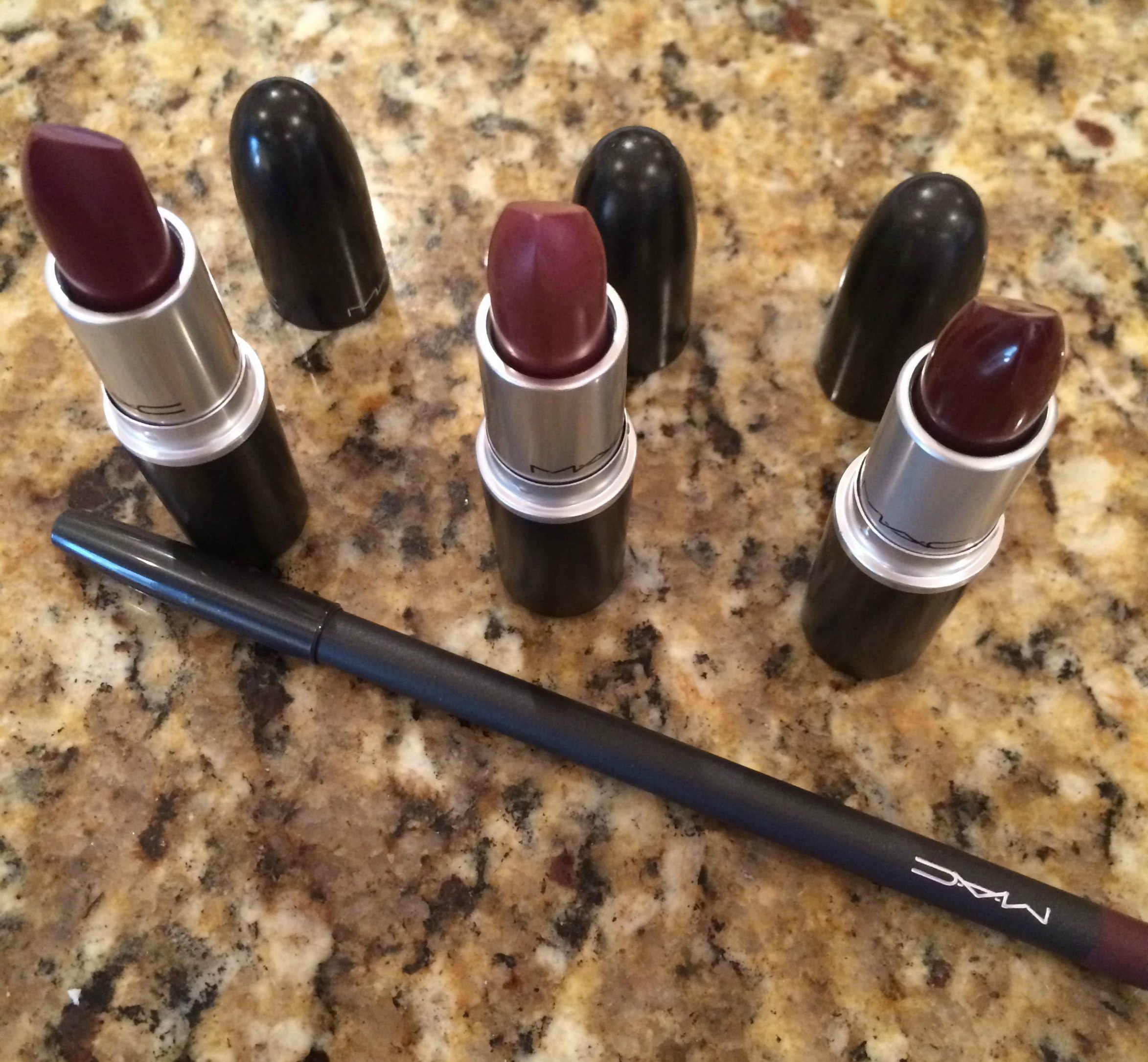 I had a couple of hours to myself yesterday at the Mall. As I am trying not to buy any new clothes for a while, plus I seem to have unintentionally embraced a sober January, I thought a little indulgence was in order. I used to treat myself to nail polishes but my nails have been such a disgrace since having my acrylics removed that I can’t even consider colored nails right now. More on that later. So instead I have become hooked on lipsticks. Last month I bought 3 beautiful deep plum colors from Mac. Rebel is still one of my all time favorites – it’s not nearly as dark on the lips as it looks in the bullet and it has a lovely soft satin finish – it really makes my teeth look whiter. Odyssey has a beautiful frost finish to it and reminds me of and old Rimmel lipstick I wore years ago – Heather Shimmer, and Hang Up is deeper and creamier than Rebel and full of moisture.