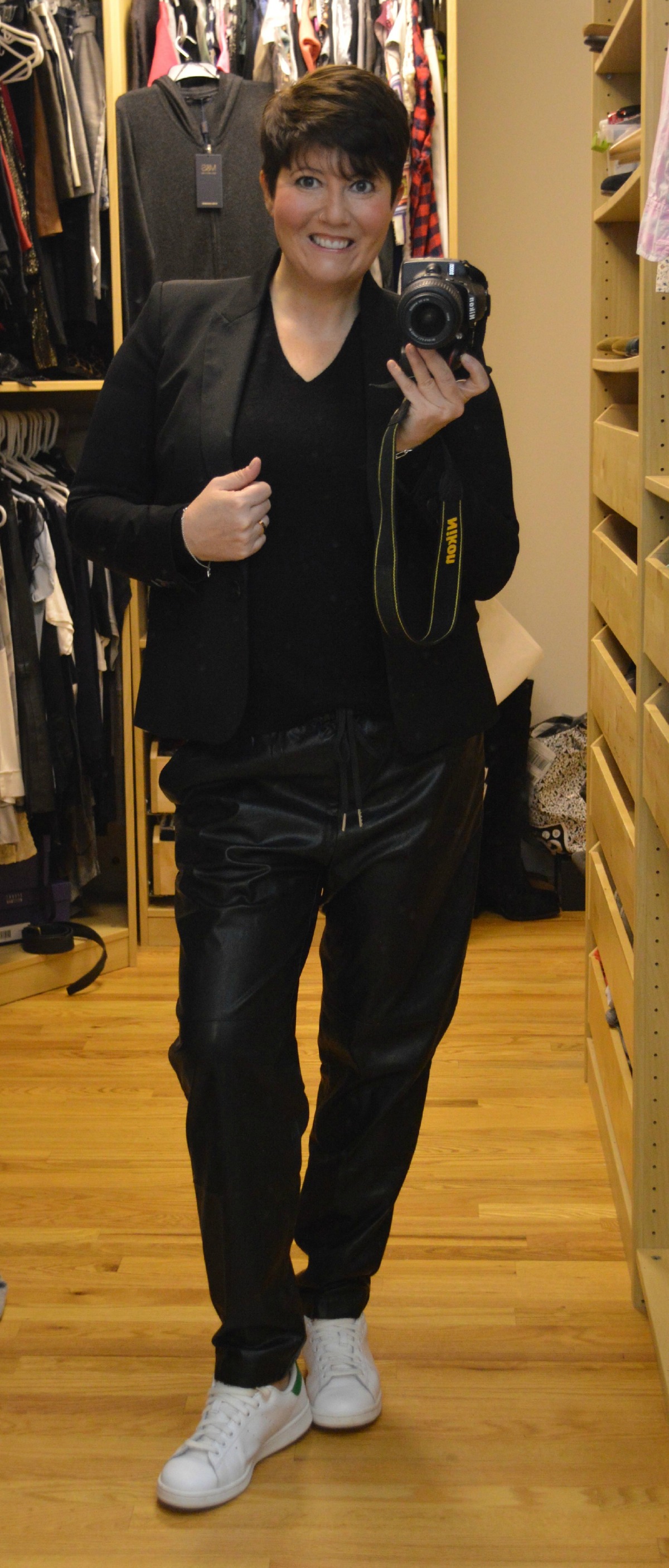DSC_0245Shoes – Stan Smith sneakers // Trousers – H&M faux leather // Sweater – Everlane cashmere v-neck // Jacket – Mango (on sale)