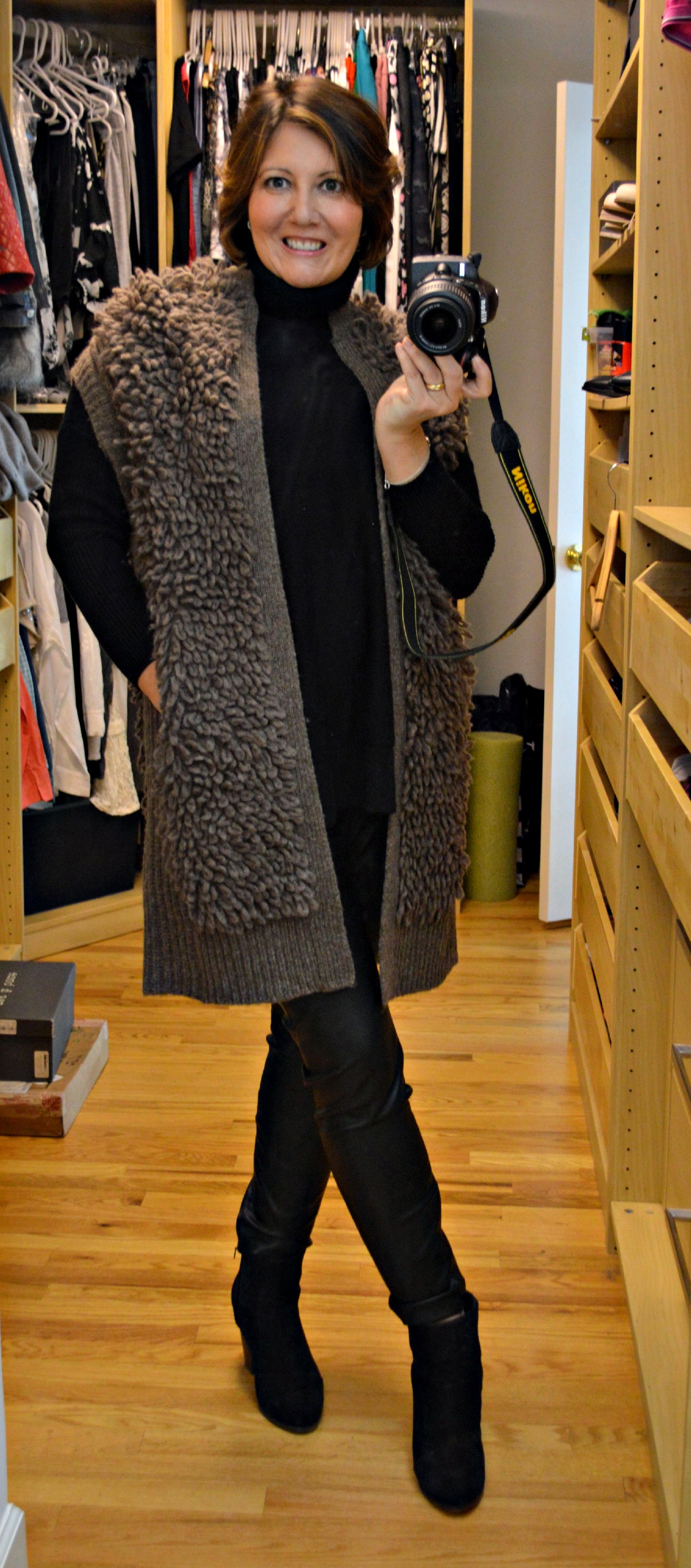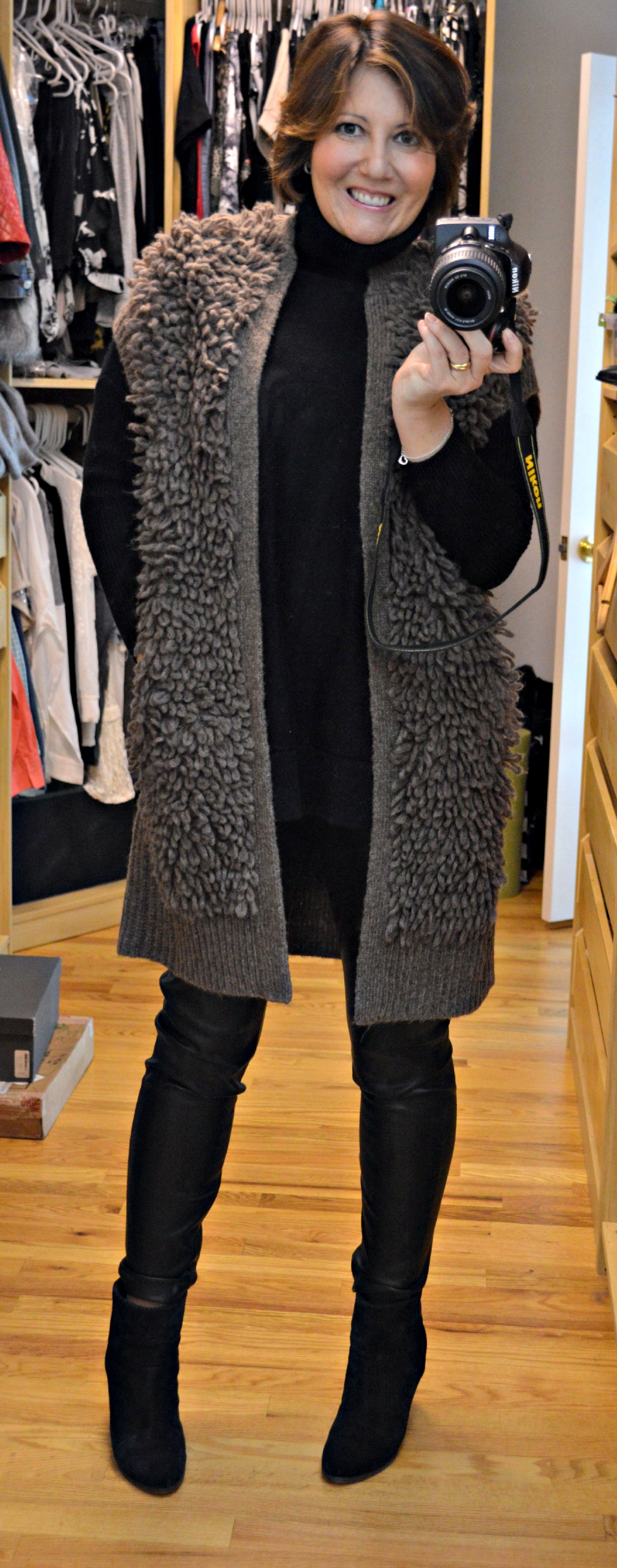 Okay my Husband asked me why I was wearing the bathroom mat – my sides were splitting – funny guy – but I LOVE my Verna gilet.  The texture adds a great dimension to an otherwise basic outfit, plus it is so soft, warm and snuggly.